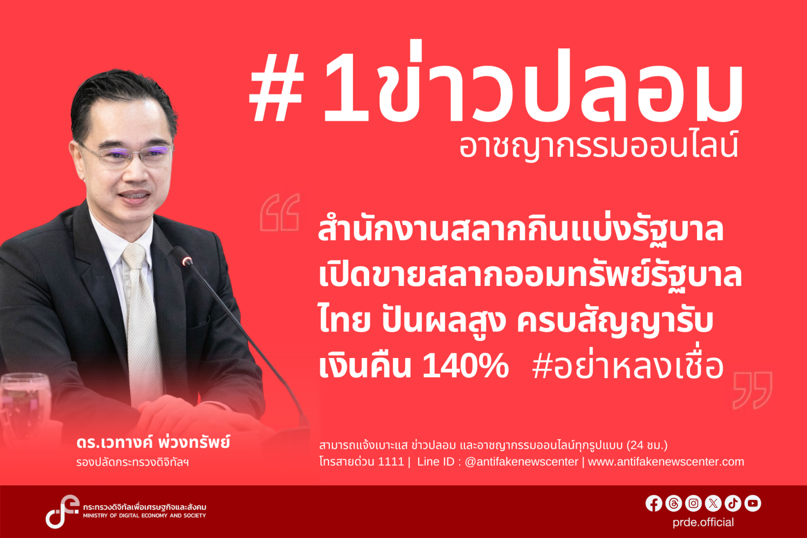 “เมื่อพิจารณาจากข่าวปลอมที่ประชาชนสนใจมากที่สุด จาก 10 อันดับข้างต้น พบว่าเป็นข่าวที่เกี่ยวข้องกับหน่วยงานรัฐ โดยเฉพาะการรับเรื่องร้องทุกข์ และการเปิดให้ลงทะเบียนผู้เสียหายจากโจรออนไลน์ มากที่สุด รวมถึงการชวนร่วมลงทุนในหน่วยงานที่มีความน่าเชื่อถือ โดยข่าวปลอมอันดับ 1 เรื่อง “สำนักงานสลากกินแบ่งรัฐบาลเปิดขายสลากออมทรัพย์รัฐบาลไทย ปันผลสูง ครบสัญญารับเงินคืน 140%” ซึ่งตรวจสอบแล้วพบว่าเป็นข้อมูลเท็จ” นายเวทางค์ กล่าว