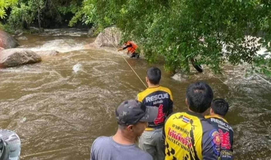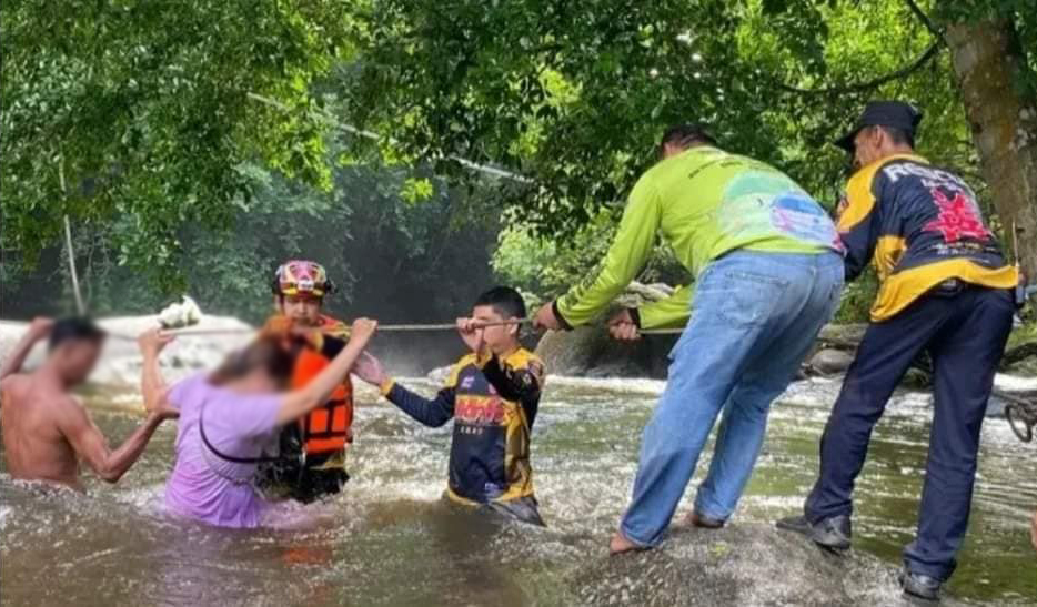 นักท่องเที่ยว 3 ชีวิต ติดอยู่บนโขดหินหลังน้ำป่าไหลหลาก หนีไม่ทัน อาสากู้ภัยเร่งช่วยเหลือปลอดภัย จ.นครศรีธรรมราช