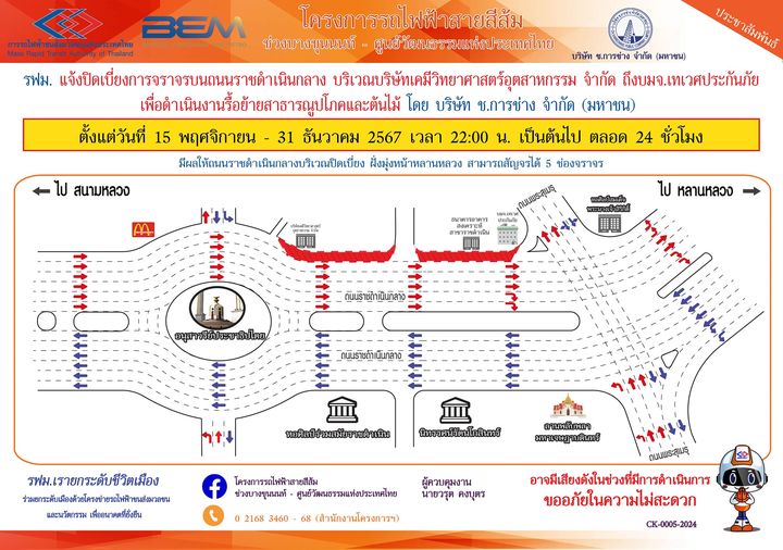 การรถไฟฟ้าขนส่งมวลชนแห่งประเทศไทย (รฟม.) แจ้งว่า บริษัท ช.การช่าง จำกัด (มหาชน) ผู้รับจ้างออกแบบและก่อสร้างอุโมงค์ทางวิ่งและสถานีใต้ดิน โครงการรถไฟฟ้าสายสีส้ม ช่วงบางขุนนนท์ - ศูนย์วัฒนธรรมแห่งประเทศไทย มีความจำเป็นต้องปิดเบี่ยงจราจร ชิดทางเท้า 1 ช่องจราจร บนถนนราชดำเนินกลาง ฝั่งขาออก มุ่งหน้าหลานหลวง บริเวณบริษัทเคมีวิทยาศาสตร์อุตสาหกรรม จำกัด ถึง บมจ.เทเวศประกันภัย เพื่อดำเนินงานรื้อย้ายสาธารณูปโภคและต้นไม้ ตั้งแต่วันที่ 15 พฤศจิกายน - 31 ธันวาคม 2567 เวลา 22.00 น. เป็นต้นไป ตลอด 24 ชั่วโมง มีผลให้ถนนราชดำเนินกลางบริเวณปิดเบี่ยง ฝั่งมุ่งหน้าหลานหลวง สามารถสัญจรได้ 5 ช่องจราจร โดยประชาชนสามารถเข้า - ออกที่พักอาศัยได้ตามปกติ