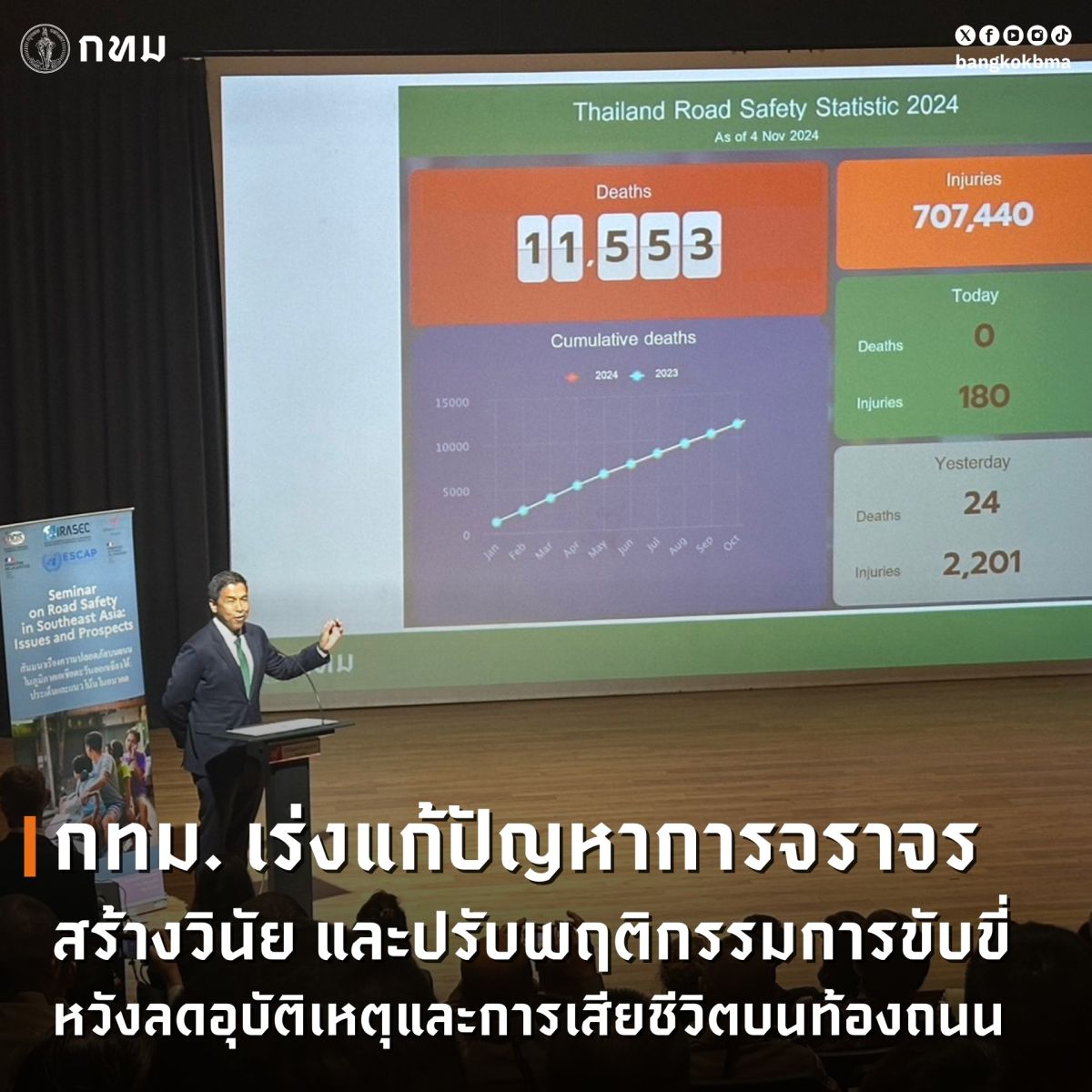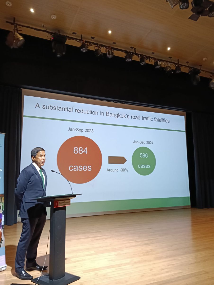 โดยผู้ว่าฯ กทม. ได้กล่าวถึงแผนดำเนินการของกรุงเทพมหานครที่มีเป้าหมายลดความเร็วของผู้ขับขี่ในกรุงเทพฯ จาก 80 กิโลเมตรต่อชั่วโมงเป็น 60 กิโลเมตรต่อชั่วโมง เพื่อลดอุบัติเหตุและการเสียชีวิตบนท้องถนน แม้สถิติจำนวนผู้เสียชีวิตจากอุบัติเหตุบนท้องถนนมีแนวโน้มลดลง แต่ก็ถือว่าเป็นตัวเลขที่สูง โดยในช่วงเดือนมกราคมถึงกันยายน ปี พ.ศ. 2566 มีผู้เสียชีวิตบนท้องถนนในกรุงเทพฯ 884 ราย ขณะที่ช่วงเวลาเดียวกันในปี พ.ศ. 2567 มีจำนวนลดลงเหลือ 596 ราย โดย 82% ของอุบัติเหตุทางถนนเกี่ยวข้องกับรถจักรยานยนต์ และ 50% มาจากการขับรถเร็วเกินกำหนด นอกจากนี้ กรุงเทพมหานครยังดำเนินการอย่างต่อเนื่องในการพัฒนาฐานข้อมูลดิจิทัลพื้นที่จุดเสี่ยงความปลอดภัย (BKK Risk Map) เพิ่มจำนวนและยกระดับคุณภาพกล้องวงจรปิด (CCTV) โดยในเดือนตุลาคมเพียงเดือนเดียว สามารถบันทึกการละเมิดกฎจราจรได้ถึง 43,000 ครั้ง โดยระบุจุดที่เสี่ยงต่อผู้ขับขี่มากถึง 100 แห่ง รวมถึงการทำให้ป้ายรถเมล์สว่าง ปลอดภัยทุกป้าย การเปลี่ยนไฟถนน 100,000 ดวง เป็นไฟ LED เพื่อให้การมองเห็นดีขึ้น โดยคาดว่าจะเปลี่ยนเพิ่มเป็น 200,000 ดวง ภายในอีก 2 ปีข้างหน้า อีกทั้งยังมีการปรับปรุงด้านกายภาพ เช่น การเร่งปรับปรุงทางม้าลาย สัญญาณไฟจราจร โดยดำเนินการแล้วกว่า 300 จุด พร้อมทั้งยังบูรณาการและประสานงานกับหน่วยงานที่เกี่ยวข้องอย่างใกล้ชิด อย่างไรก็ดี การดำเนินการของหน่วยงานรัฐแต่ฝ่ายเดียวยังไม่เพียงพอ เพราะส่วนหนึ่งเป็นเรื่องของพฤติกรรมผู้ใช้รถใช้ถนนด้วย โดยเฉพาะวินัยจราจรและพฤติกรรมการขับขี่ เช่น รถจักรยานยนต์ต้องสวมหมวกกันน็อก การหยุดรถให้คนข้ามถนน จำเป็นอย่างยิ่งที่ต้องเร่งสร้างวินัยจราจรของคนกรุงเทพฯ ให้ดียิ่งขึ้น เพื่อให้กรุงเทพฯ เป็นเมืองน่าอยู่และปลอดภัยอย่างยั่งยืน