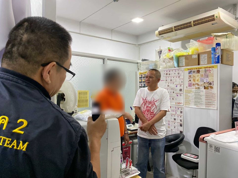 ทั้งนี้ เมื่อสายลับส่งสัญญาณ หลังจากทำทีเข้าไปขอบริการฯ เจ้าหน้าที่ตำรวจและสาธารณสุข ที่เฝ้าสังเกตการณ์อยู่โดยรอบ จึงแสดงตัวเข้าจับกุมตัว นายกอ (นามสมมุติ) อายุ 47 ปี เจ้าของคลินิกดังกล่าวเป็นผู้ให้บริการและทำหน้าที่ในการตรวจ ซึ่งไปพบของกลางธนบัตรที่ใช้ล่อซื้อวางอยู่ในลิ้นชักคิดเงิน ตรวจสอบข้อมูลภายในคอมพิวเตอร์ นายกอ ยังเคยออกใบรับรองแพทย์คลินิกยังไม่ได้การยื่นขอใบอนุญาต ขณะที่บริเวณด้านหลังคลินิค มีอุปกรณ์เครื่องมือตรวจ เหมือนห้องแล็บขยาดย่อม ภายในถังขยะพบอุปกรณ์ตรวจโรคที่ใช้แล้วเป็นจำนวนมาก