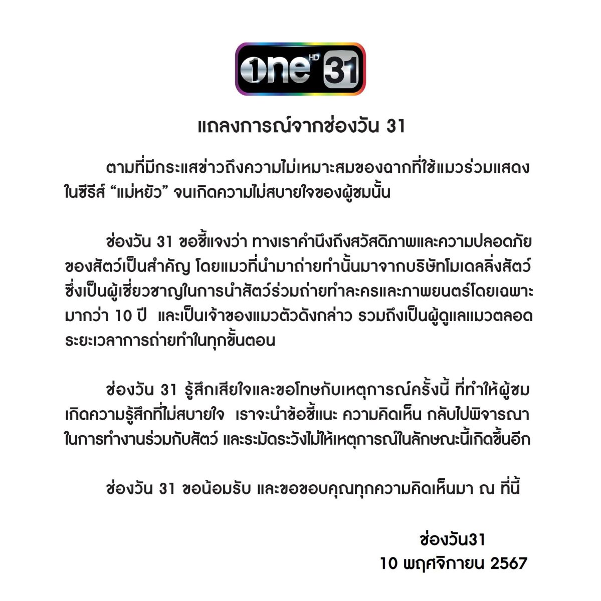 ช่องวัน 31 ขอชี้แจงว่า ทางเราคำนึงถึงสวัสดิภาพและความปลอดภัย ของสัตว์เป็นสำคัญ โดยแมวที่นำมาถ่ายทำนั้นมาจากบริษัทโมเดลลิ่งสัตว์ ซึ่งเป็นผู้เชี่ยวชาญในการนำสัตว์ร่วมถ่ายทำละครและภาพยนตร์โดยเฉพาะ มากว่า 10 ปี และเป็นเจ้าของแมวตัวดังกล่าว รวมถึงเป็นผู้ดูแลแมวตลอด ระยะเวลาการถ่ายทำในทุกขั้นตอน