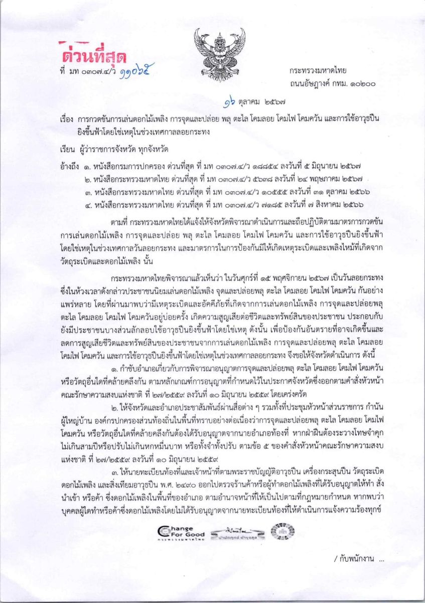 มท.1 สั่งเข้มช่วงเทศกาลลอยกระทง กำชับทุกพื้นที่กวดขัน พลุ ดอกไม้เพลิง โคมลอย และห้ามยิงปืนขึ้นฟ้า ฝ่าฝืนมีบทลงโทษตามกฎหมายเด็ดขาด