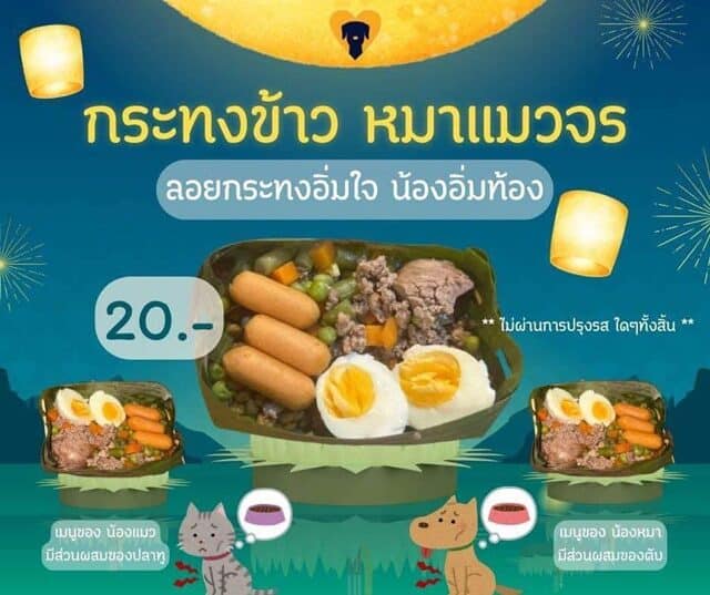 โดยพวกเราใช้ใบตองเป็นภาชนะเพื่อลดขยะในวันลอยกระทง วัตถุดิบเป็นสิ่งที่น้องหมาน้องแมวสามารถทานได้(ไม่มีการใส่เครื่องปรุงใดๆทั้งสิ้น) ปลอดภัย แถมยังได้บุญอีกด้วย น้องๆหมา-แมวจรได้อิ่มท้อง