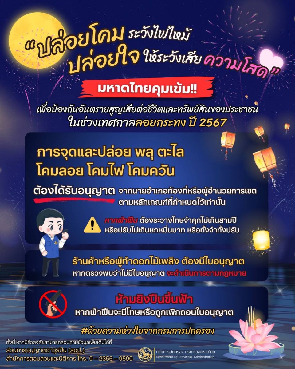 มหาดไทยคุมเข้ม !!! วันลอยกระทงปีนี้ตรงกับวันศุกร์ที่ 15 พฤศจิกายน 2567 กระทรวงมหาดไทยเน้นย้ำกวดขันการเล่นดอกไม้เพลิง การจุดพลุและปล่อยพลุ ตะไล โคมลอย โคมไฟ โคมควัน และการใช้อาวุธปืนยิงขึ้นฟ้าโดยใช้เหตุในช่วงเทศกาลลอยกระทง เพื่อป้องกันอันตรายจากเหตุดังกล่าว