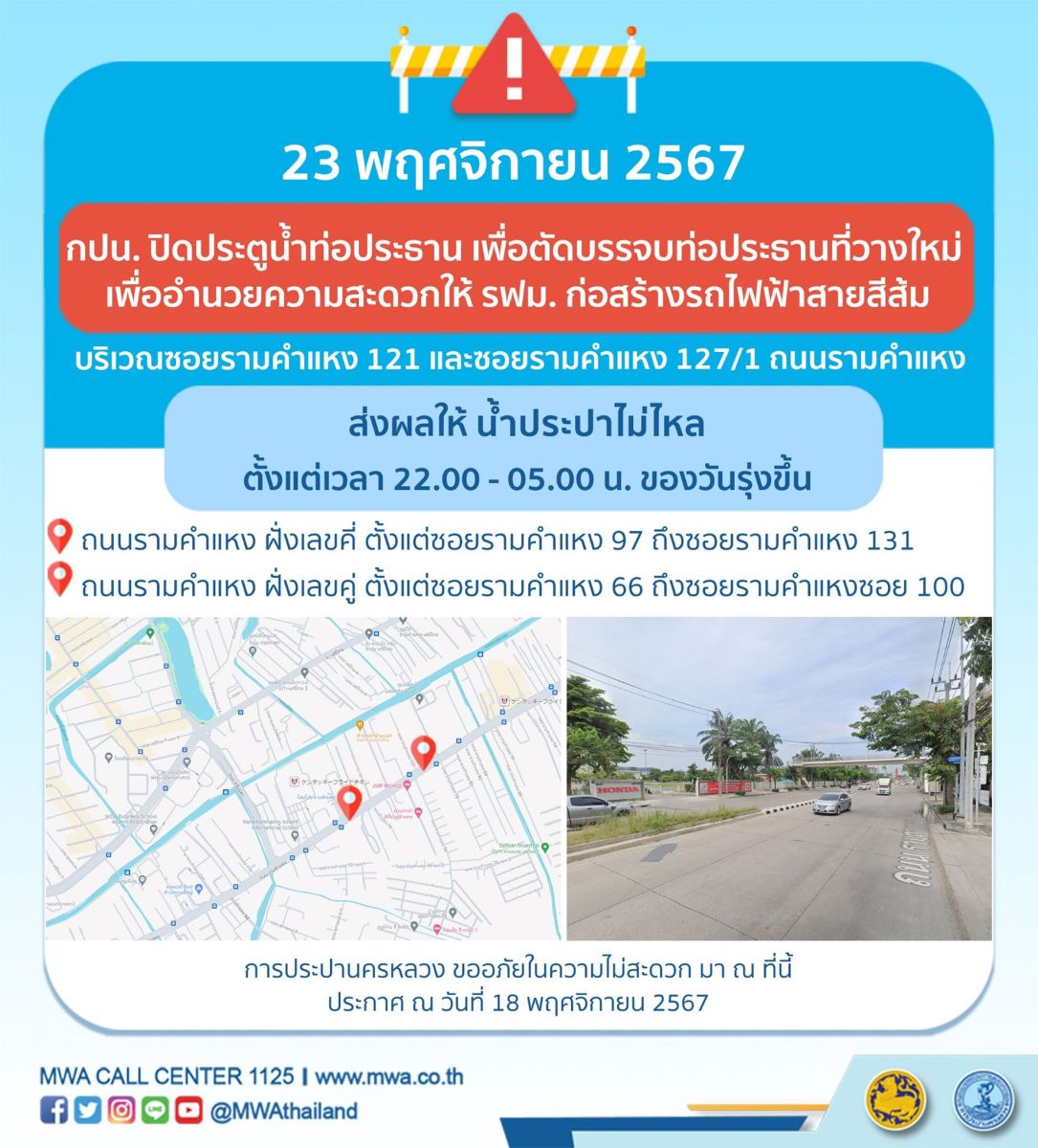 การประปานครหลวง (กปน.) มีความจำเป็นต้องปิดประตูน้ำท่อประธานขนาดเส้นผ่านศูนย์กลาง 800 มิลลิเมตร เพื่อตัดบรรจบท่อประธานเดิม เข้ากับท่อประธานที่วางใหม่ บริเวณซอยรามคำแหง 121 และซอยรามคำแหง 127/1 ถนนรามคำแหง ในคืนวันเสาร์ที่ 23 พฤศจิกายน 2567 ตั้งแต่เวลา 22.00 - 05.00 น. ของวันรุ่งขึ้น เพื่ออำนวยความสะดวกให้โครงการก่อสร้างรถไฟฟ้าสายสีส้ม ของการรถไฟฟ้าขนส่งมวลชนแห่งประเทศไทย (รฟม.) รวมถึงเพื่อให้ประชาชนได้รับบริการน้ำประปาอย่างเพียงพอและทั่วถึง โดยระหว่างดำเนินการ ส่งผลให้ น้ำประปาไม่ไหล ในพื้นที่ดังต่อไปนี้