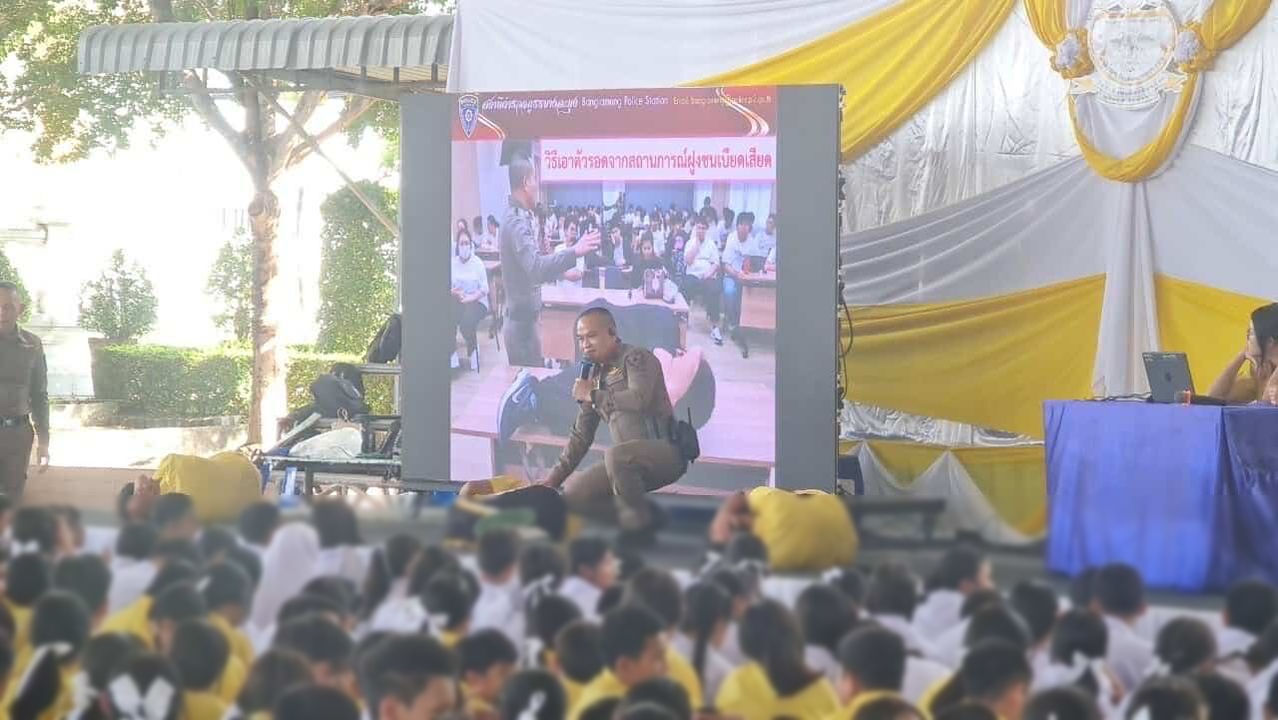 19 พฤศจิกายน 2567 - ที่โรงเรียนเมืองพัทยา 11 จ.ชลบุรี ได้จัดกิจกรรมบรรยายให้ความรู้ซักซ้อมแผนเผชิญเหตุให้กับนักเรียน โดยมี พ.ต.ต.สุชาติ ดุสดี สวป.สภ.บางละมุง หรือสารวัตรชาติ นายตำรวจน้ำดี เจ้าของรางวัล ”แหวนอัศวิน“ ได้นำคณะวิทยากรจาก สภ.บางละมุง ร่วมบรรยายให้ความรู้ กับนักเรียนชั้น ม.1 ถึง ชั้น ม.6 จำนวน 1,600 คน