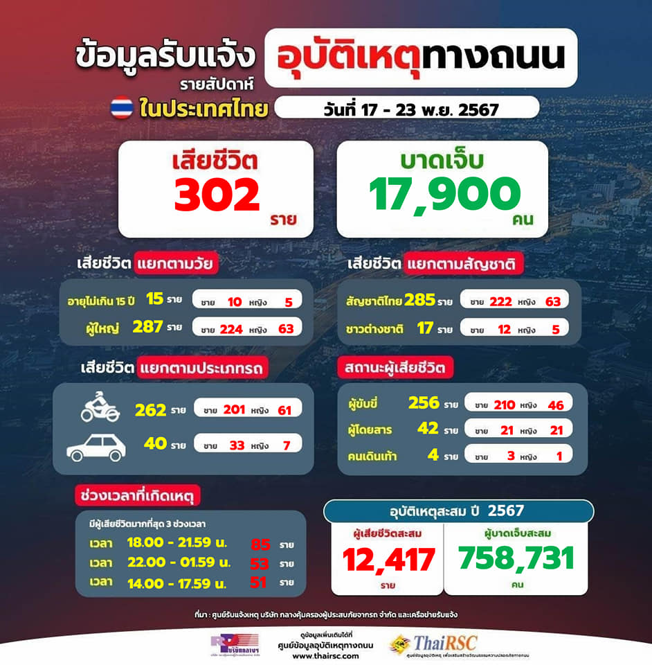 ส่วนข้อมูลรับเเจ้งอุบัติเหตุทางถนน รายสัปดาห์ ระหว่างวันที่ 17-23 พฤศจิกายน 2567 มีผู้เสียชีวิต 302 ราย บาดเจ็บ 17,900 คน