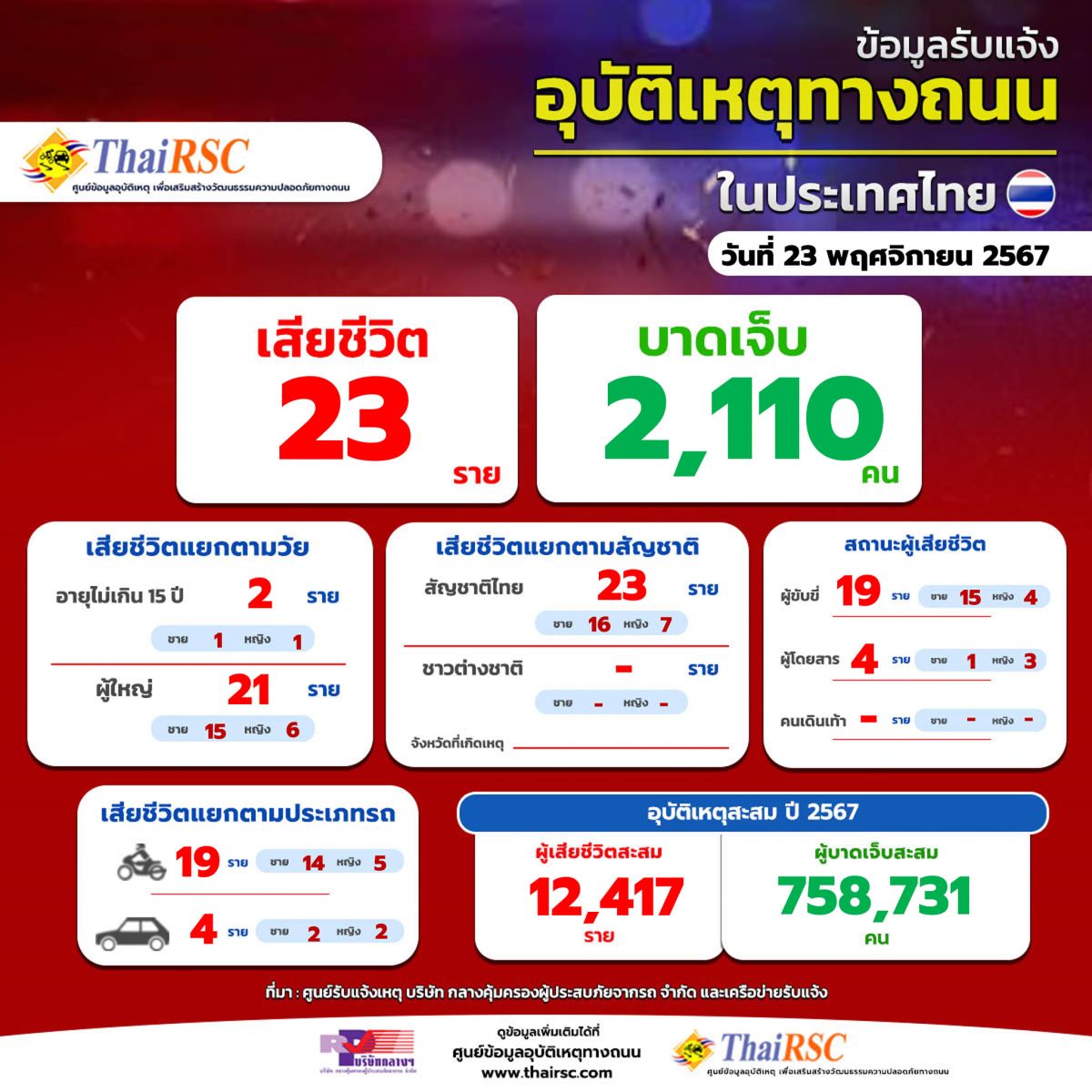 ศูนย์ข้อมูลอุบัติเหตุทางถนน (ThaiRSC) บริษัทกลางฯ เปิดเผยข้อมูลรับเเจ้งอุบัติเหตุทางถนนในรอบ 24 ชม. วันที่ 23 พฤศจิกายน 2567 ว่ามีผู้เสียชีวิต 23 ราย มีผู้ได้รับบาดเจ็บ 2,110 คน