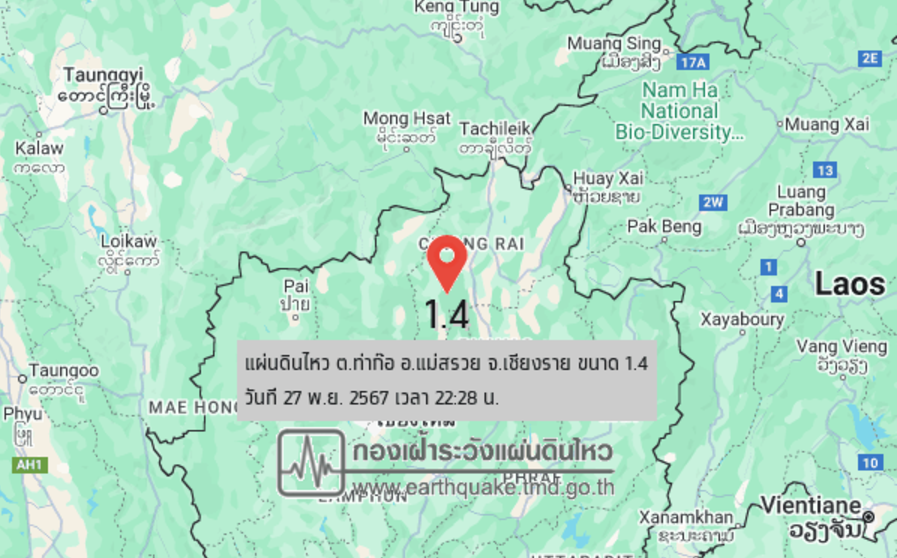 เวลา 22.28 น. วันที่ 27 พฤศจิกายน 2567 กองเฝ้าระวังแผ่นดินไหว กรมอุตุนิยมวิทยา แจ้งเหตุแผ่นดินไหว ขนาด 1.4 ความลึก 1 กม. ภายในพื้นที่ของ ต.ท่าก๊อ อ.แม่สรวย จ.เชียงราย ยังไม่มีรายงานผลกระทบจากแรงสั่นสะเทือน