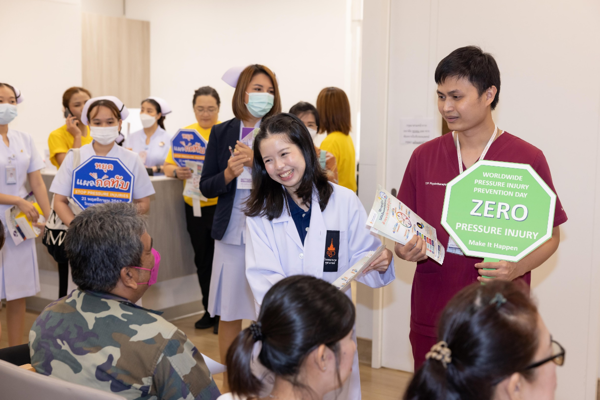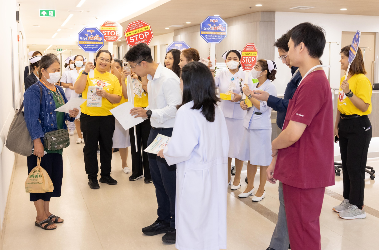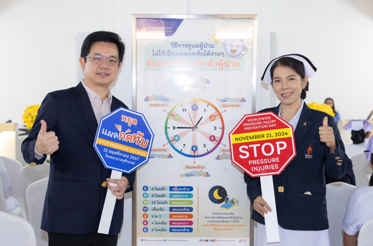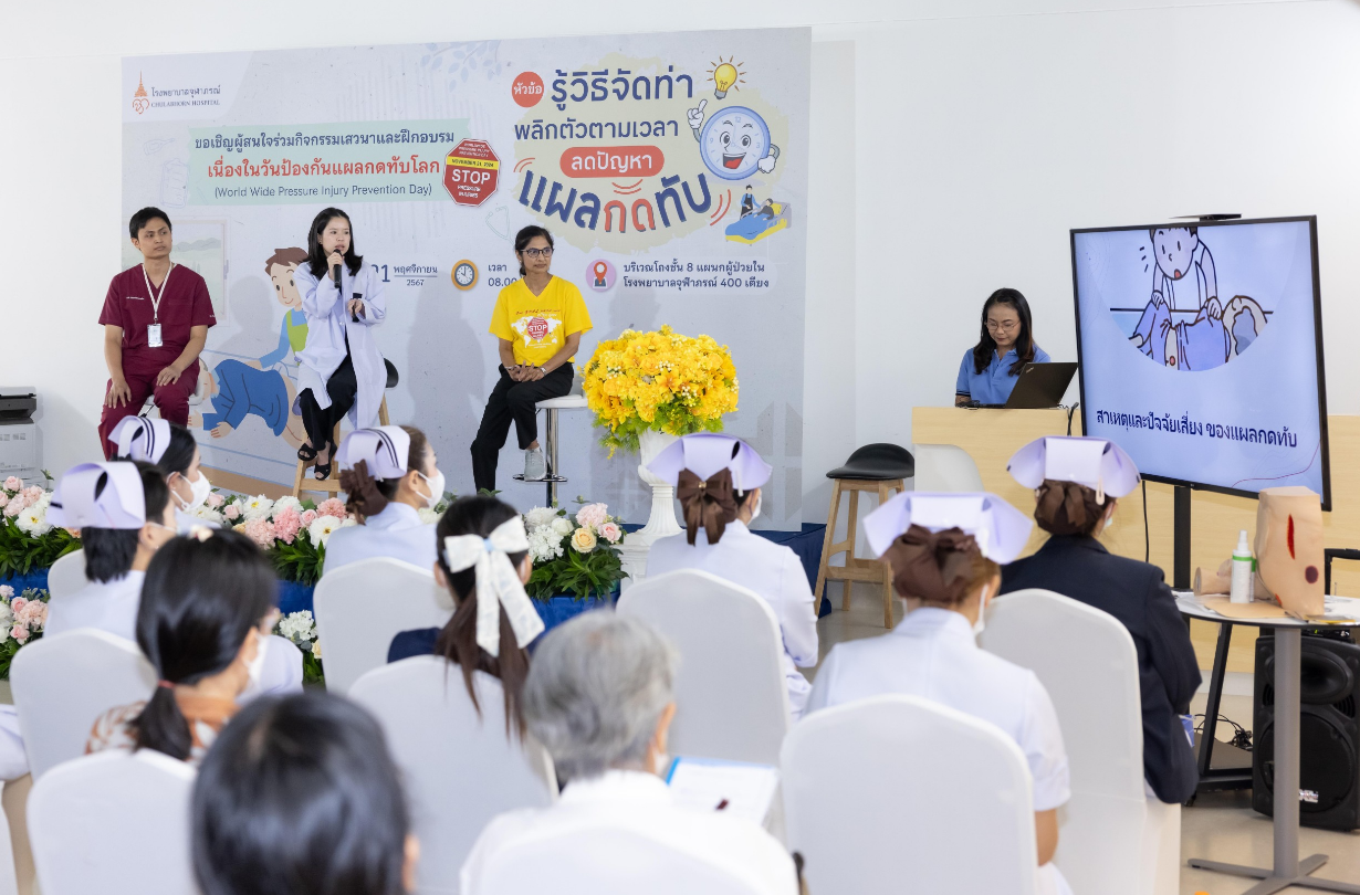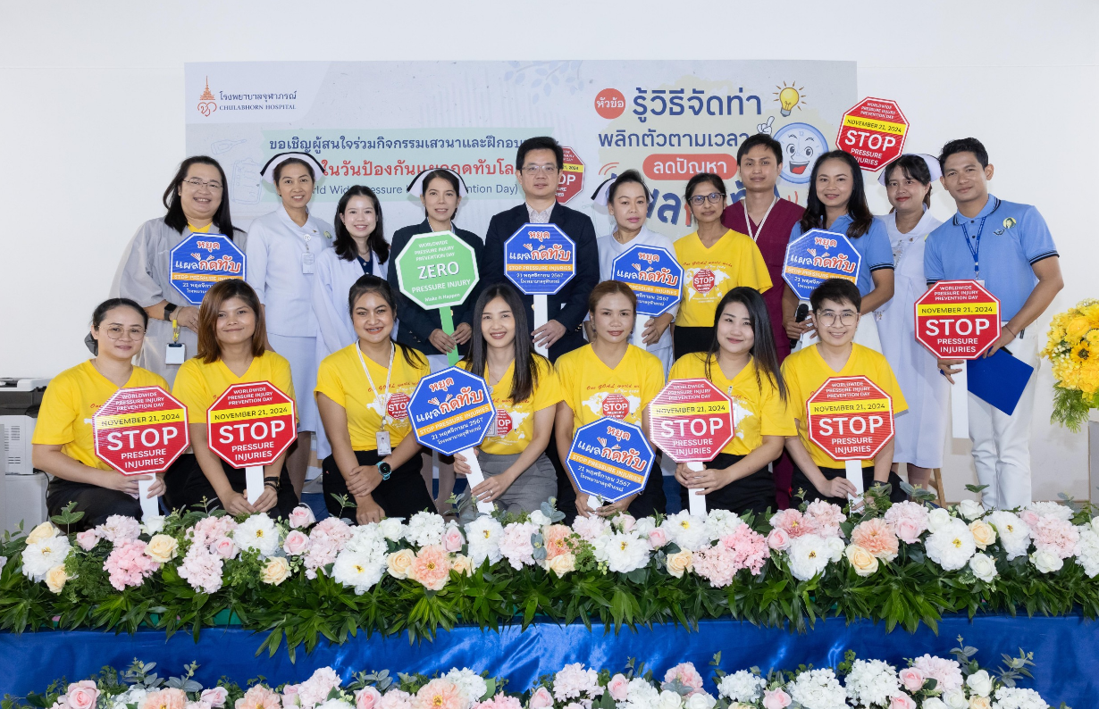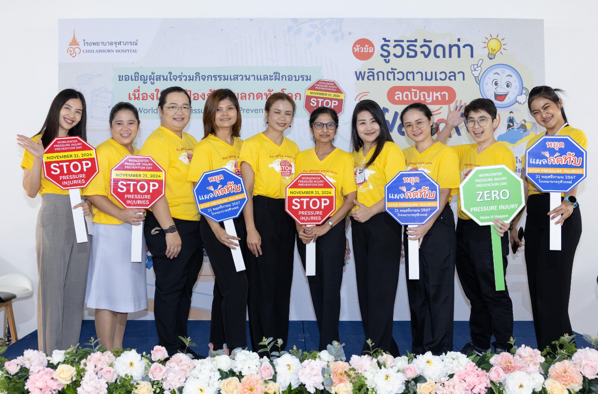 เมื่อวันที่ 21 พฤศจิกายน 2567 ฝ่ายการพยาบาลโรงพยาบาลจุฬาภรณ์ ร่วมรณรงค์สร้างความตระหนักรู้ถึงความสำคัญของการเกิดแผลกดทับ จัดกิจกรรมเสวนาและฝึกอบรม หัวข้อ “ รู้วิธีจัดท่า พลิกตัวตามเวลา ลดปัญหา แผลกดทับ ” เนื่องในวันป้องกันแผลกดทับโลก (World Wide Pressure Injury Prevention Day) โดยมีนายแพทย์อดิศร บุญญาภิบาล ผู้ช่วยผู้อำนวยการโรงพยาบาลจุฬาภรณ์ เป็นประธานกล่าวเปิดงาน พร้อมด้วยทีมแพทย์ พยาบาล บุคลากรทางการแพทย์และประชาชนทั่วไปเข้าร่วมงาน ณ บริเวณโถงชั้น 8 แผนกผู้ป่วยใน อาคารโรงพยาบาลจุฬาภรณ์ ขนาด 400 เตียง ภายในงานได้จัดเวทีเสวนาให้ความรู้ในหัวข้อ “ดูแลอย่างไรให้ห่างไกลแผลกดทับ” กิจกรรมแลกเปลี่ยนเรียนรู้ วิธีการป้องกันและดูแลผู้ป่วยแผลกดทับ และการสาธิตวิธีจัดท่าเพื่อลดปัญหาแผลกดทับ โดยแพทย์หญิงชัญญา วุฒิไกรกุล แพทย์เฉพาะทางด้านอายุรศาสตร์ผู้สูงอายุ โรงพยาบาลจุฬาภรณ์ พว.สิริมา เจริญภัทรเภสัช พยาบาลวิชาชีพ และ กภ.ธนวัฒน์ หนองตรุต นักกายภาพบำบัด โรงพยาบาลจุฬาภรณ์ พร้อมกันนี้ได้จัดกิจกรรมเดินรณรงค์เพื่อสร้างความตระหนักรู้ ลดปัญหาการเกิดแผลกดทับให้กับผู้ป่วยและญาติที่เข้ารับบริการที่โรงพยาบาลจุฬาภรณ์ ณ หอผู้ป่วยในชั้น 8 Ward 8/1 , 8/2 และ 8/3 แผนกผู้ป่วยนอก อายุรกรรมและศัลยกรรม ชั้น 2 อาคารโรงพยาบาลจุฬาภรณ์ ขนาด 400 เตียง และหอผู้ป่วยใน Ward 7 และ Ward 8 อาคารศูนย์การแพทย์มะเร็งวิทยาจุฬาภรณ์ โรงพยาบาลจุฬาภรณ์ เขตหลักสี่ กรุงเทพมหานคร