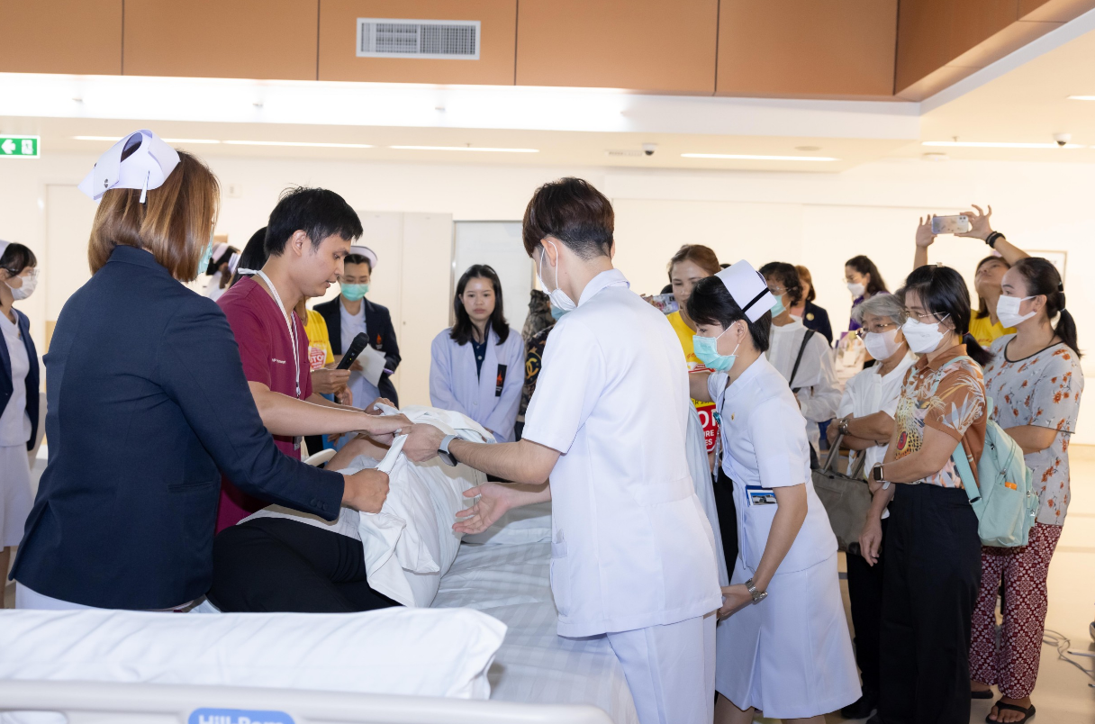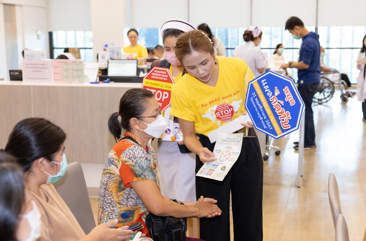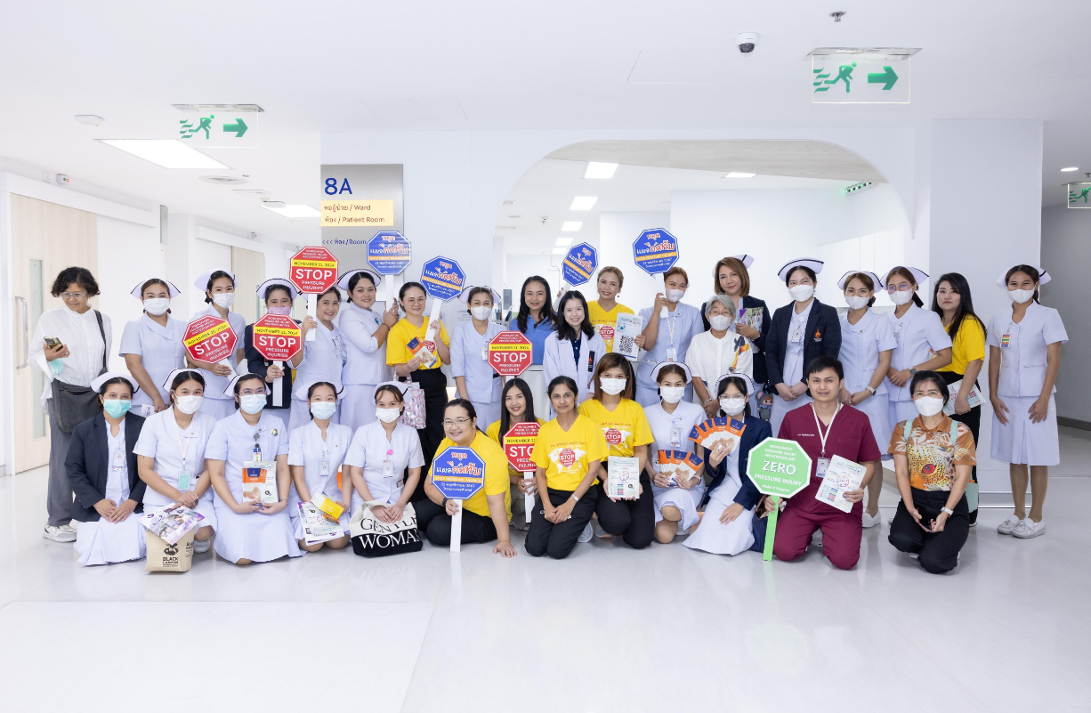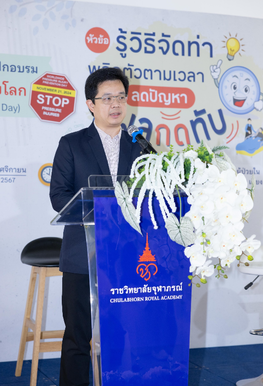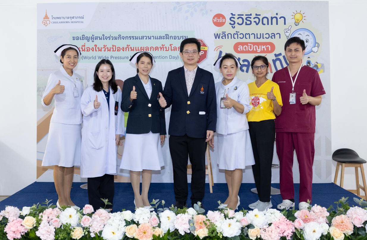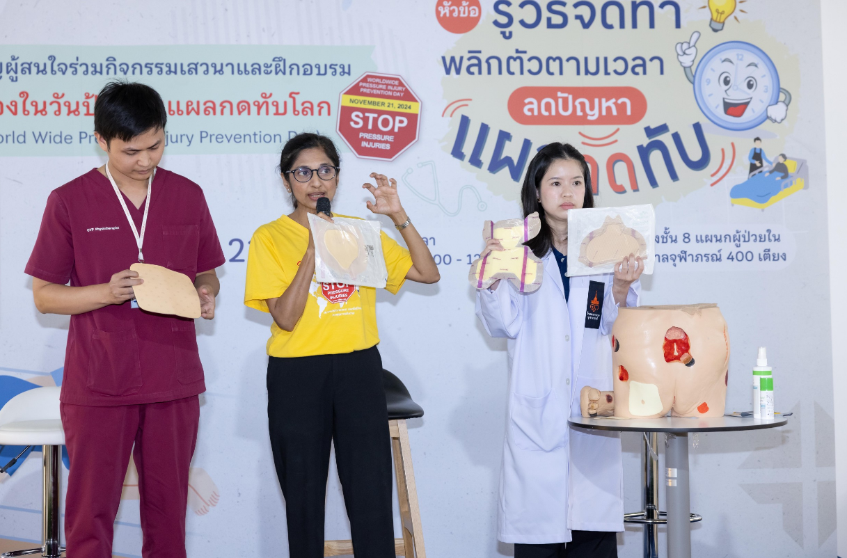 เมื่อวันที่ 21 พฤศจิกายน 2567 ฝ่ายการพยาบาลโรงพยาบาลจุฬาภรณ์ ร่วมรณรงค์สร้างความตระหนักรู้ถึงความสำคัญของการเกิดแผลกดทับ จัดกิจกรรมเสวนาและฝึกอบรม หัวข้อ “ รู้วิธีจัดท่า พลิกตัวตามเวลา ลดปัญหา แผลกดทับ ” เนื่องในวันป้องกันแผลกดทับโลก (World Wide Pressure Injury Prevention Day) โดยมีนายแพทย์อดิศร บุญญาภิบาล ผู้ช่วยผู้อำนวยการโรงพยาบาลจุฬาภรณ์ เป็นประธานกล่าวเปิดงาน พร้อมด้วยทีมแพทย์ พยาบาล บุคลากรทางการแพทย์และประชาชนทั่วไปเข้าร่วมงาน ณ บริเวณโถงชั้น 8 แผนกผู้ป่วยใน อาคารโรงพยาบาลจุฬาภรณ์ ขนาด 400 เตียง ภายในงานได้จัดเวทีเสวนาให้ความรู้ในหัวข้อ “ดูแลอย่างไรให้ห่างไกลแผลกดทับ” กิจกรรมแลกเปลี่ยนเรียนรู้ วิธีการป้องกันและดูแลผู้ป่วยแผลกดทับ และการสาธิตวิธีจัดท่าเพื่อลดปัญหาแผลกดทับ โดยแพทย์หญิงชัญญา วุฒิไกรกุล แพทย์เฉพาะทางด้านอายุรศาสตร์ผู้สูงอายุ โรงพยาบาลจุฬาภรณ์ พว.สิริมา เจริญภัทรเภสัช พยาบาลวิชาชีพ และ กภ.ธนวัฒน์ หนองตรุต นักกายภาพบำบัด โรงพยาบาลจุฬาภรณ์ พร้อมกันนี้ได้จัดกิจกรรมเดินรณรงค์เพื่อสร้างความตระหนักรู้ ลดปัญหาการเกิดแผลกดทับให้กับผู้ป่วยและญาติที่เข้ารับบริการที่โรงพยาบาลจุฬาภรณ์ ณ หอผู้ป่วยในชั้น 8 Ward 8/1 , 8/2 และ 8/3 แผนกผู้ป่วยนอก อายุรกรรมและศัลยกรรม ชั้น 2 อาคารโรงพยาบาลจุฬาภรณ์ ขนาด 400 เตียง และหอผู้ป่วยใน Ward 7 และ Ward 8 อาคารศูนย์การแพทย์มะเร็งวิทยาจุฬาภรณ์ โรงพยาบาลจุฬาภรณ์ เขตหลักสี่ กรุงเทพมหานคร