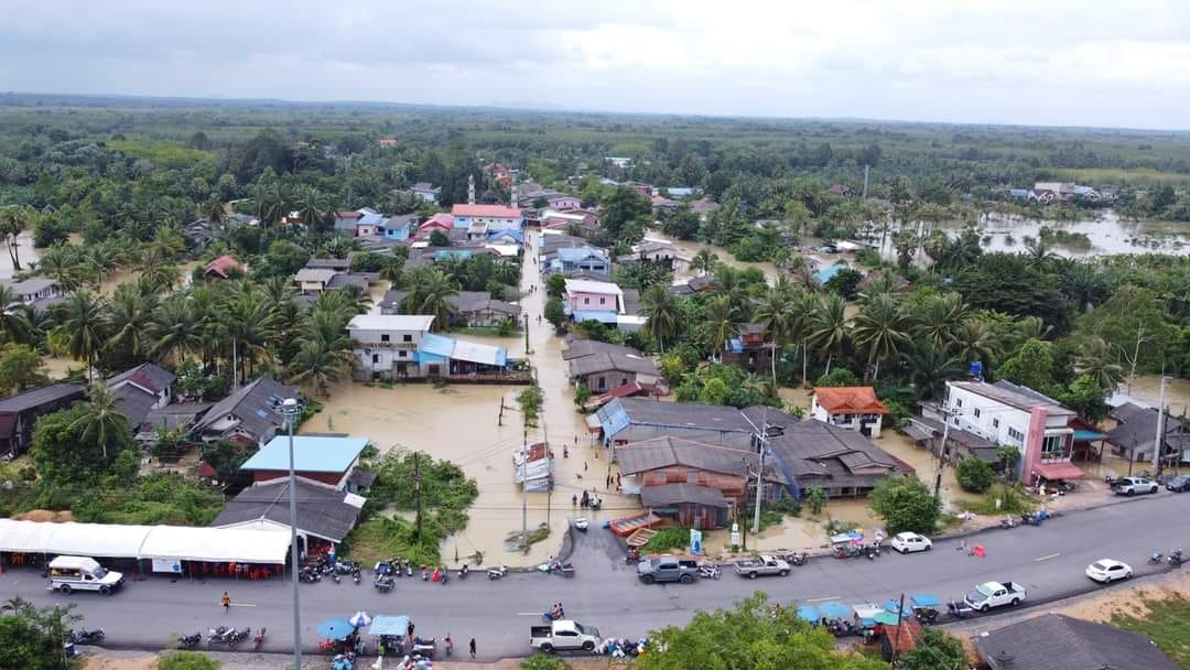 อย่างที่บริเวณบ้านบางมวง ต.ฝาละมี อ.ปากพะยูน จ.พัทลุง อย่างภาพมุมสูงอย่างที่เห็นพบว่า บ้านเรือนประชาชนยังคงมีน้ำท่วมสูง เนื่องจากหมู่บ้านดังกล่าวอยู่ติดดับลำคลอง และเส้นทางเข้าออกหมู่ ชาวบ้านยังต้องเดินลุยน้ำที่ท่วมเกือบ 50 ซม.และบางจุดยังสูงเกือบ 1 เมตร
