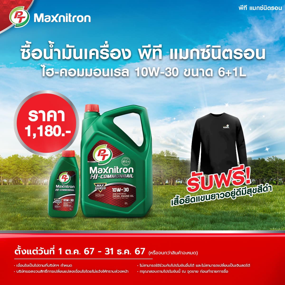 โปรฉ่ำ บอกลาหน้าฝน รับฟรี! เสื้อยืดแขนยาวอยู่ดีมีสุขสีดำ* เมื่อซื้อน้ำมันเครื่อง พีที แมกซ์นิตรอน ไฮ-คอมมอนเรล 10W-30 ขนาด 6+1L ราคา 1,180.-