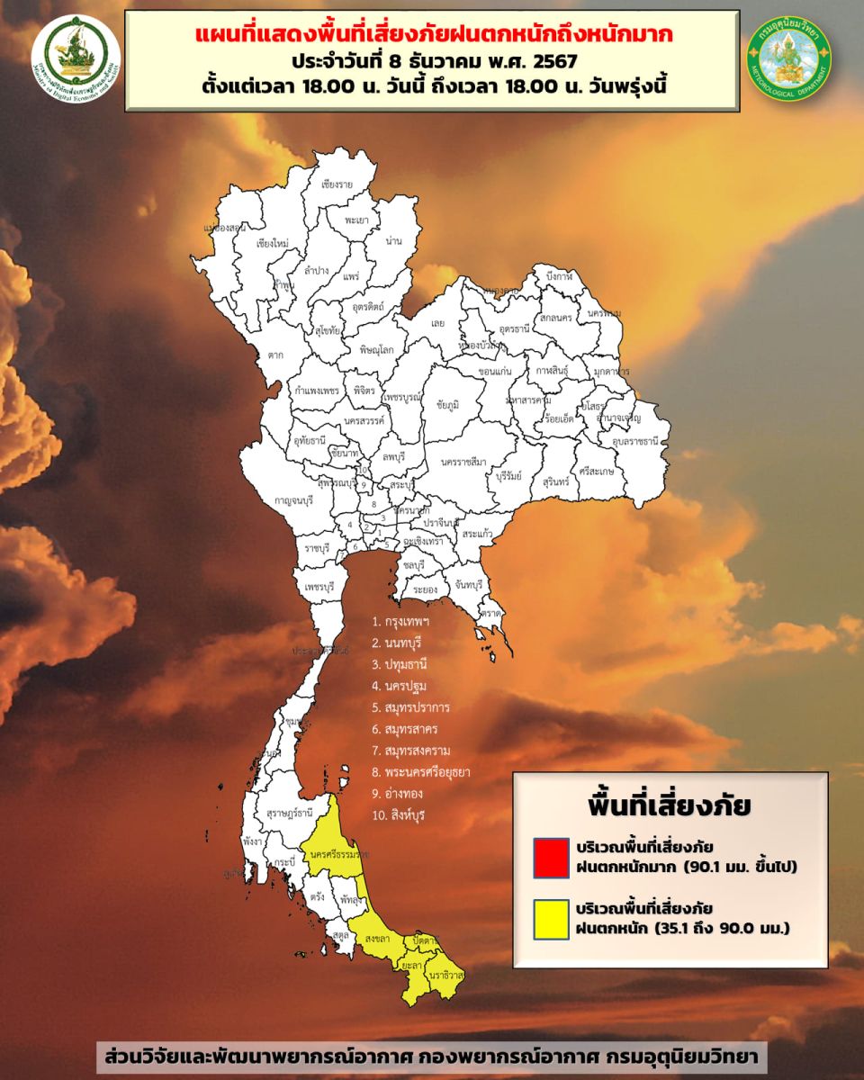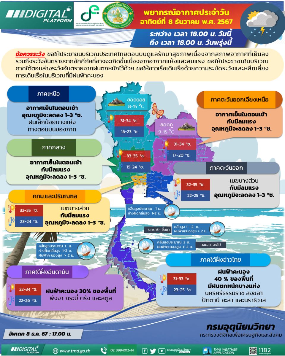 วันที่ 8 ธันวาคม 2567 กรมอุตุนิยมวิทยา พยากรณ์อากาศ 24 ชั่วโมงข้างหน้า บริเวณความกดอากาศสูงหรือมวลอากาศเย็นกำลังปานกลางระลอกใหม่จากประเทศจีนได้แผ่ลงมาปกคลุมประเทศไทยตอนบน และทะเลจีนใต้ ลักษณะเช่นนี้ทำให้ประเทศไทยตอนบนมีอากาศเย็นลง กับมีลมแรง และอุณหภูมิจะลดลง 1–3 องศาเซลเซียส สำหรับบริเวณยอดดอยและยอดภูมีอากาศหนาว ขอให้ประชาชนในบริเวณดังกล่าวดูแลรักษาสุขภาพเนื่องจากสภาพอากาศที่เย็นลง รวมถึงระวังอันตรายจากอัคคีภัยที่อาจจะเกิดขึ้นเนื่องจากอากาศแห้งและลมแรง