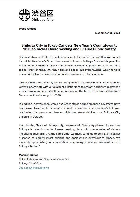 วันที่ 10 ธันวาคม 2567 สำนักข่าวซินหัวรายงานว่าเขตชิบูย่า หนึ่งในจุดหมายการท่องเที่ยวและย่านความบันเทิงยามค่ำคืนยอดนิยมในกรุงโตเกียวของญี่ปุ่น ประกาศยกเลิกการจัดกิจกรรมเคานต์ดาวน์ปีใหม่หน้าสถานีรถไฟชิบูย่าติดต่อกันเป็นปีที่ 5 แล้ว