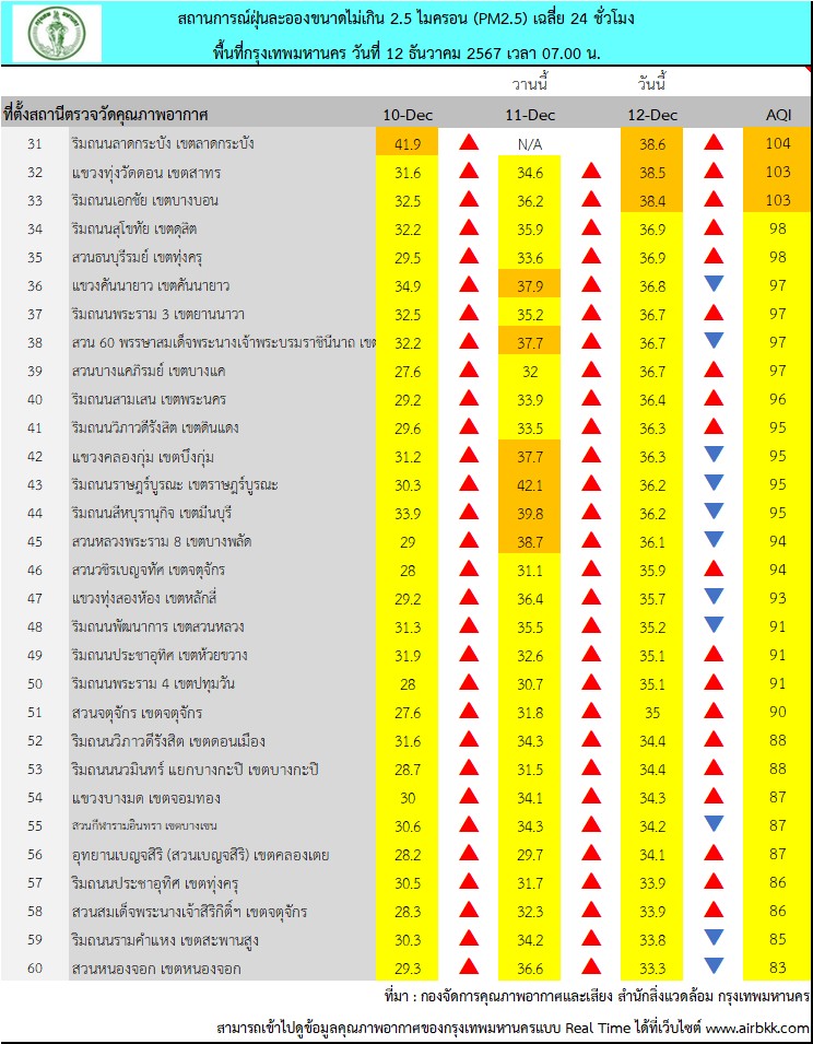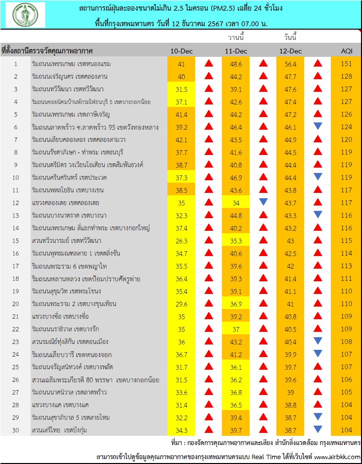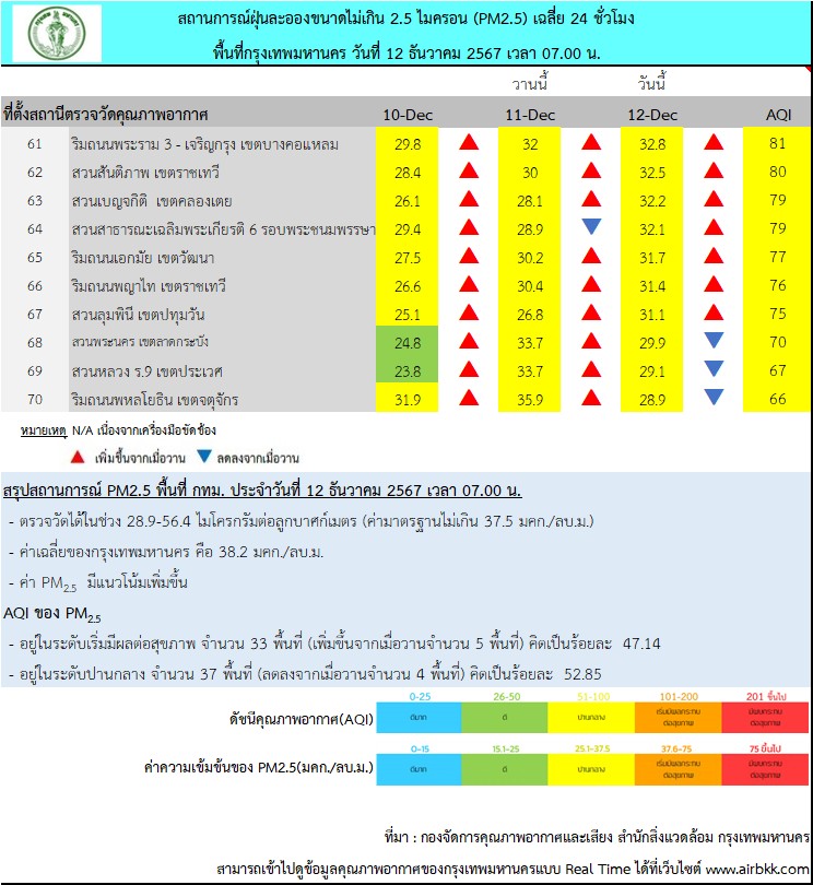 ศูนย์ข้อมูลคุณภาพอากาศกรุงเทพมหานครขอรายงานสถานการณ์ฝุ่นละออง PM 2.5 ของสถานีตรวจวัดคุณภาพอากาศของกรุงเทพมหานคร ประจำวันพฤหัสบดีที่ 12 ธันวาคม พ.ศ. 2567 เวลา 07.00 น. ค่าเฉลี่ย 24 ชั่วโมง ของฝุ่นละอองขนาดไม่เกิน 2.5 ไมครอน (PM2.5) ตรวจวัดได้ 28.9-56.4 ไมโครกรัม/ลูกบาศก์เมตร (มคก./ลบ.ม.) พบว่าเกินมาตรฐานอยู่ในระดับสีส้ม เริ่มมีผลกระทบต่อสุขภาพ (มาตรฐานไม่เกิน 37.5 มคก./ลบ.ม.) จำนวน 33 พื้นที่ คือ