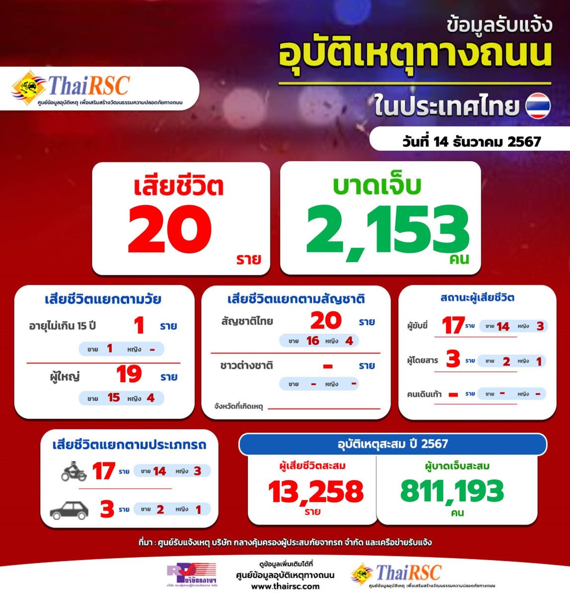ศูนย์ข้อมูลอุบัติเหตุทางถนน (ThaiRSC) บริษัทกลางฯ เปิดเผยข้อมูลรับเเจ้งอุบัติเหตุทางถนนในรอบ 24 ชม. วันที่ 14 ธันวาคม 2567 ว่ามีผู้เสียชีวิต 20 ราย มีผู้ได้รับบาดเจ็บ 2,153 คน