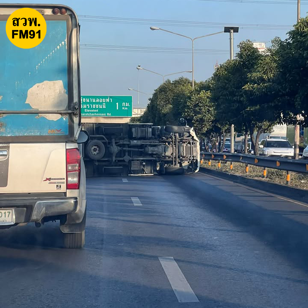 รถบรรทุก 4 ล้อใหญ่ พลิกตะแคง อยู่ในช่องทางหลัก กีดขวางจราจร 2 เลนขวา