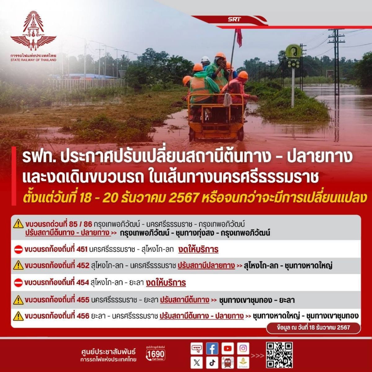การรถไฟฯ ประกาศงดเดินขบวนรถ และปรับเปลี่ยนสถานีต้นทาง – ปลายทาง เส้นทางนครศรีธรรมราช ตั้งแต่วันที่ 18 – 20 ธันวาคม 2567 จนกว่าจะมีประกาศเปลี่ยนแปลง ดังนี้