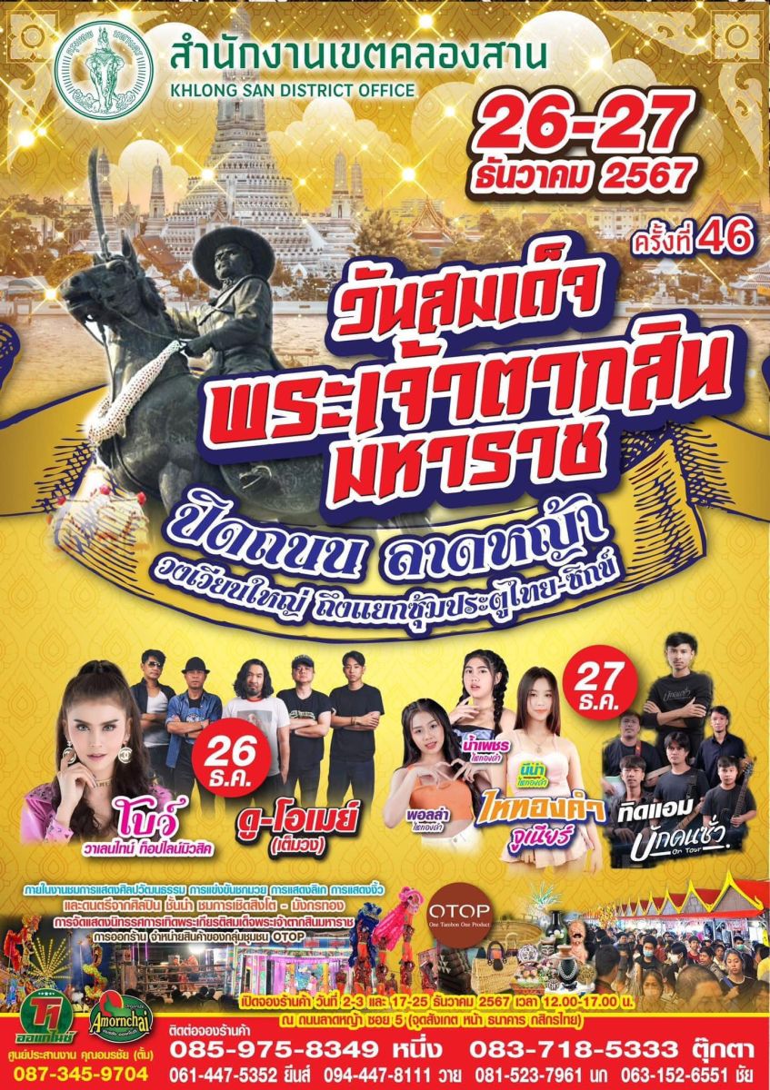 สำหรับในปีนี้เป็นการจัดงานครั้งที่ 46 โดยกำหนดจัดงานระหว่างวันที่ 26 - 28 ธันวาคม 2567 และแบ่งพื้นที่หลักในการจัดงาน เป็น 2 ส่วน คือ บริเวณถนนลาดหญ้า เขตคลองสาน และบริเวณลานพระบรมราชานุสาวรีย์สมเด็จพระเจ้าตากสินมหาราช (วงเวียนใหญ่) เขตธนบุรี การแถลงข่าวในวันนี้ นายสมชาย เต็มไพบูลย์กุล ส.ก.เขตคลองสาน ผู้บริหารสำนักวัฒนธรรม กีฬา และการท่องเที่ยว ผู้อำนวยการเขตฝั่งธนบุรี ร่วมพิธี