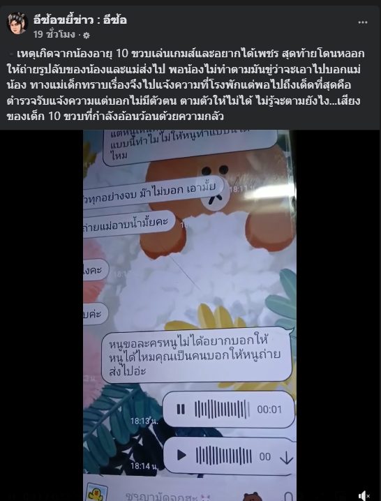 20 ธันวาคม 2567 เฟซบุ๊กเพจ "อีซ้อขยี้ข่าว : อีซ้อ" โพสต์ข้อความระบุว่า "เรื่่องนี้มีประโยชน์ และเป็นอุทาหรณ์ให้สำหรับผู้ปกครองที่ชอบปล่อยให้เด็กเล่นมือถือเพียงลำพัง" พร้อมภาพที่แคปมาจากข้อความการสนทนาในแอปพลิเคชั่นไลน์ ระหว่างเด็กน้อยวัย 10 ขวบกับมิจฉาชีพรายหนึ่งหลอกล่อว่าจะแจกเพชรในเกม พร้อมระบุข้อความว่า "เหตุเกิดจากน้องอายุ 10 ขวบ เล่นเกมและอยากได้เพชร สุดท้ายโดนหลอกให้ถ่ายรูปลับของน้อง และแม่ส่งไป พอน้องไม่ทำตามมันขู่ว่าจะเอาไปบอกแม่น้อง ทางแม่เด็กทราบเรื่องจึงไปแจ้งความที่โรงพัก แต่พอไปถึง เด็ดที่สุดคือตำรวจรับแจ้งความแต่บอกไม่มีตัวตน ตามตัวให้ไม่ได้ ไม่รู้จะตามยังไง เสียงของเด็ก 10 ขวบที่กำลังอ้อนว้อนด้วยความกลัว" ซึ่งภายในคลิปเป็นเสียงของเด็กน้อยวัย 10 ขวบ ร้องไห้ออกมา พร้อมบอกว่า "หนูไม่คิดจะถ่ายด้วย หนูก็บอกอยู่ว่าหนูไม่เอาแล้ว แค่อย่าบอกแม่หนูได้ไหม หนูไม่อยากทำอะไรแล้ว"