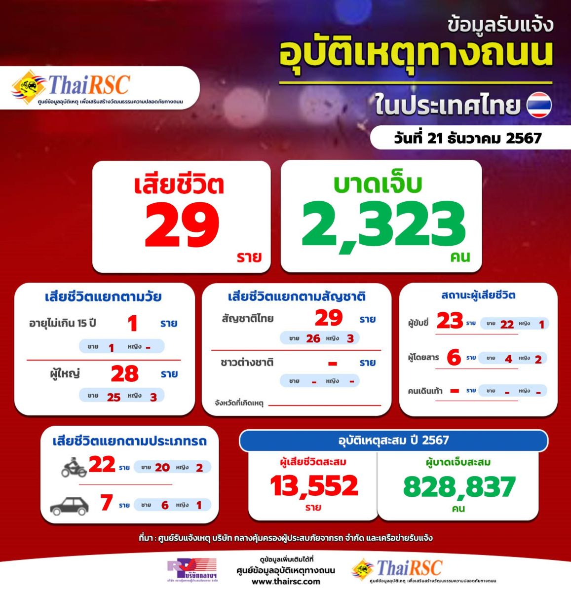 ศูนย์ข้อมูลอุบัติเหตุทางถนน (ThaiRSC) บริษัทกลางฯ เปิดเผยข้อมูลรับเเจ้งอุบัติเหตุทางถนนในรอบ 24 ชม. วันที่ 21 ธันวาคม 2567 ว่ามีผู้เสียชีวิต 29 ราย มีผู้ได้รับบาดเจ็บ 2,323 คน