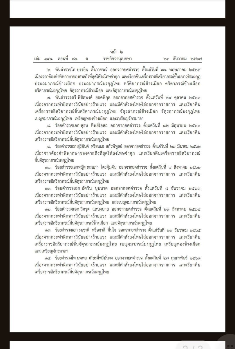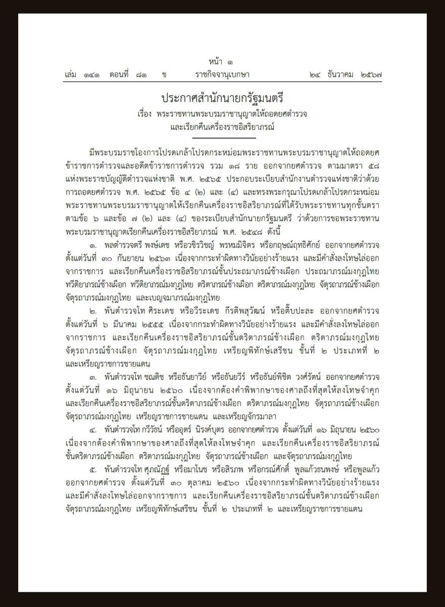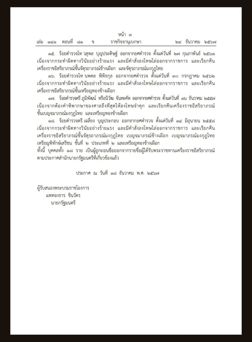 วันที่ 25 ธันวาคม 2567 พระบรมราชโองการโปรดเกล้าโปรดกระหม่อม พระราชทานพระบรมราชานุญาตให้ถอดยศข้าราชตำรวจและอดีตข้าราชการตำรวจ รวม 18 ราย และ โปรดเกล้าฯ พระราชทานพระบรมราชานุญาตให้ เรียกคืนเครื่องราชอิสริยาภรณ์ ดังนี้