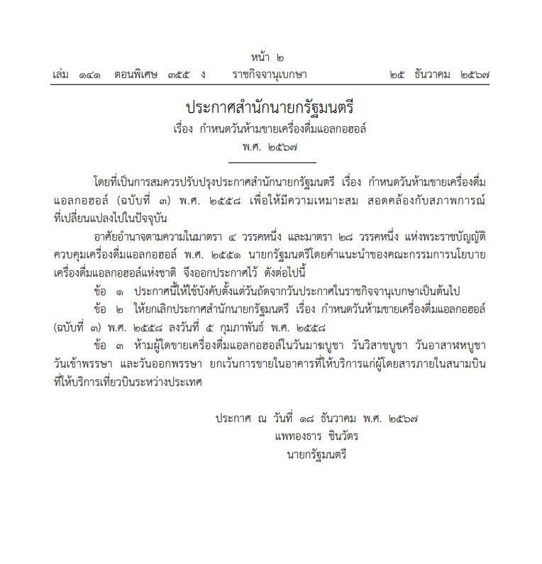 วันที่ 26 ธันวาคม 2567 ผู้สื่อข่าวรายงานว่า เมื่อวันที่ 25 ธันวาคม ราชกิจจานุเบกษา เผยแพร่ ประกาศสำนักนายกรัฐมนตรี เรื่อง กำหนดวันห้ามขายเครื่องดื่มแอลกอฮอล์ พ.ศ. 2567 ความว่า โดยที่เป็นการสมควรปรับปรุงประกาศสำนักนายกรัฐมนตรี เรื่อง กำหนดวันห้ามขายเครื่องดื่มแอลกอฮอล์ (ฉบับที่ 3) พ.ศ. 2558 เพื่อให้มีความเหมาะสม สอดคล้องกับสภาพการณ์ที่เปลี่ยนแปลงไปในปัจจุบัน