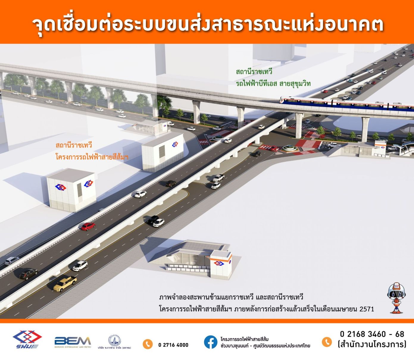 โดยผู้รับจ้างมีแผนจะเริ่มดำเนินการก่อสร้างสะพานข้ามแยกราชเทวีคืนในเดือนธันวาคม 2569 และคาดว่าจะเปิดใช้งานได้ในเดือนเมษายน 2571 โดยภายหลังเปิดใช้สะพานข้ามแยกราชเทวี ผู้ใช้เส้นทางจะสามารถกลับมาสัญจรบนสะพานฝั่งขาออกได้ 2 ช่องจราจร และสัญจรทางราบบนถนนเพชรบุรีฝั่งขาเข้าและขาออกได้ฝั่งละ 2 ช่องจราจรเหมือนเดิม ซึ่งเมื่อโครงการแล้วเสร็จจะทำให้เกิดจุดเชื่อมต่อระบบขนส่งสาธารณะอีกแห่งหนึ่ง ที่จะช่วยเพิ่มทางเลือก ในการเดินทางให้กับประชาชน ลดการใช้รถยนต์ส่วนบุคคล และเพิ่มประสิทธิภาพการจราจรบนท้องถนนให้มีความคล่องตัวมากยิ่งขึ้น