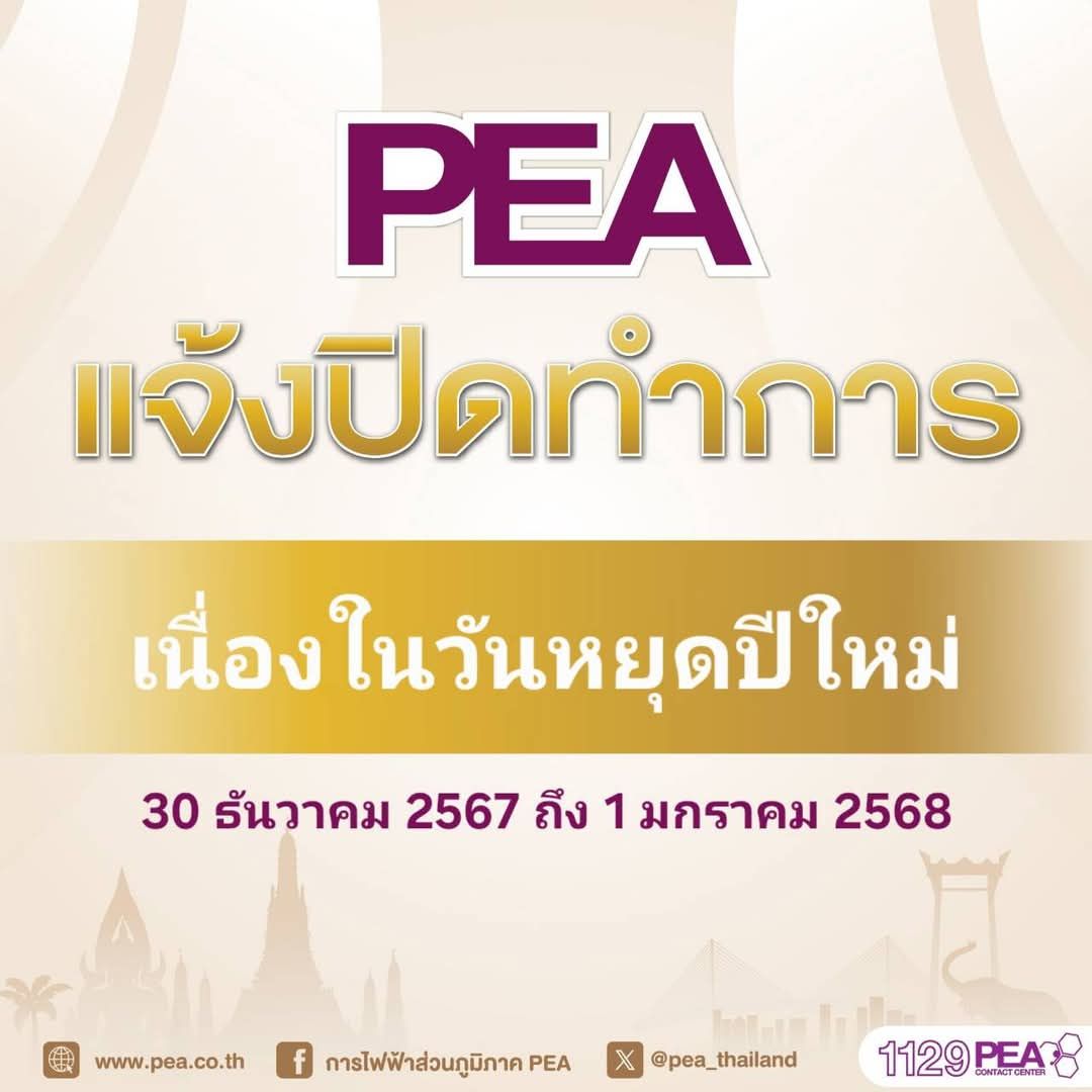 การไฟฟ้าส่วนภูมิภาค (PEA) แจ้งปิดทำการช่วงเทศกาลปีใหม่ วันที่ 30 ธันวาคม 2567 ถึง 1 มกราคม 2568 เพื่ออำนวยความสะดวกแก่ผู้ใช้ไฟฟ้าในการชำระค่าไฟฟ้า PEA แนะนำให้ผู้ใช้ไฟฟ้าชำระค่าไฟฟ้าผ่านทางช่องทางออนไลน์ ดังนี้