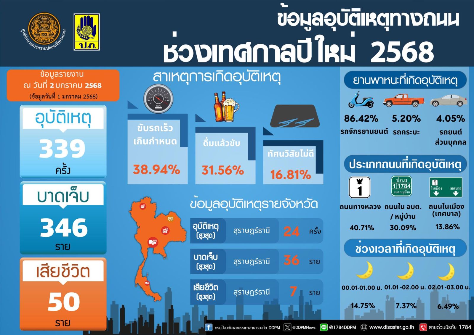 วันนี้ (2 ม.ค.68) นายภาสกร บุญญลักษม์ อธิบดีกรมป้องกันและบรรเทาสาธารณภัย เป็นประธานแถลงข่าวการประชุมศูนย์อำนวยการป้องกันและลดอุบัติเหตุทางถนนช่วงเทศกาลปีใหม่ 2568 และแถลงข้อมูลช่วง 10 วันอันตราย ระหว่างวันที่ 27 ธ.ค. 2567 ถึง 5 ม.ค. 2568 วันที่ 6 (1 ม.ค.68) ว่า เกิดอุบัติเหตุ 339 ครั้ง มีผู้เสียชีวิต จำนวน 50 ราย ซึ่งเพิ่มขึ้นร้อยละ 35.14 ผู้บาดเจ็บจำนวน 346 คน เพิ่มขึ้นร้อยละ 39.52 โดยจังหวัดเกิดอุบัติเหตุสูงสุด สุราษฎร์ธานี จำนวน 24 ครั้ง รองลงมาคือ สงขลา 13 ครั้ง ประจวบคีรีขันธ์และลพบุรี 12 ครั้ง