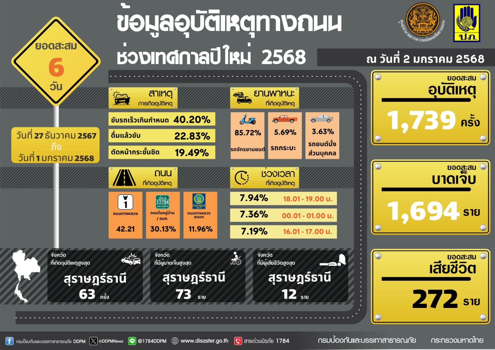 ส่วนจำนวนอุบัติเหตุสะสมระหว่างวันที่ 27 ธันวาคม 2567 – 1 มกราคม 2568 รวม 6 วัน มีจำนวนอุบัติเหตุสะสม 1,739 ครั้ง จำนวนผู้เสีย ชีวิต 272 ราย จำนวนผู้บาดเจ็บ 1,694 คน