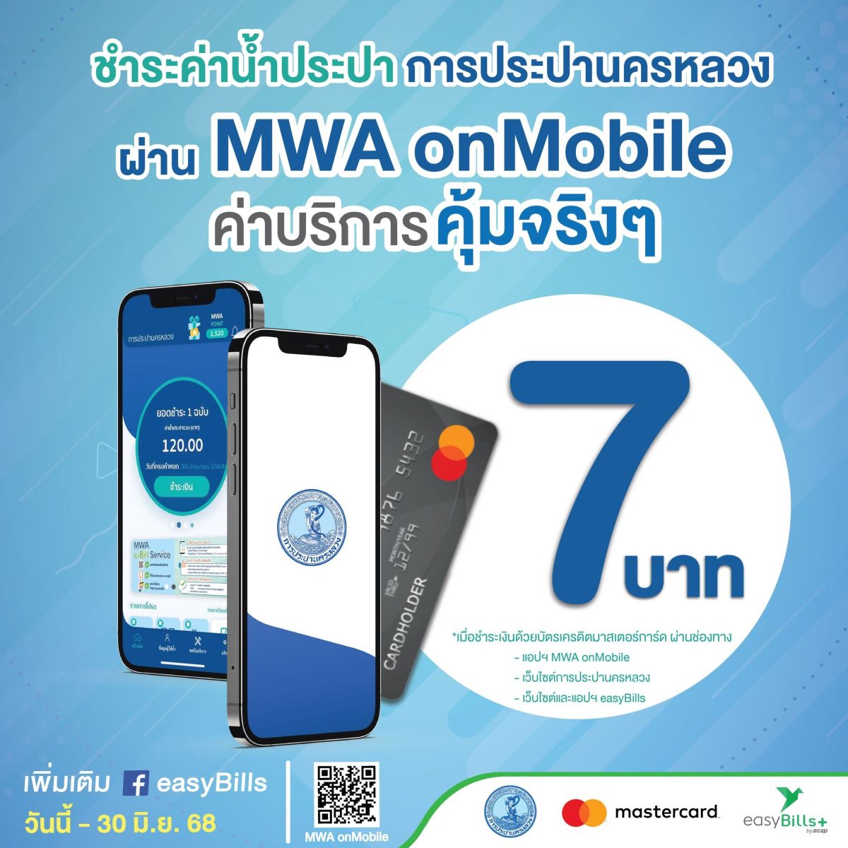 การประปานครหลวง (กปน.) ร่วมกับ บริษัท ทูซีทูพี (ประเทศไทย) จำกัด (2C2P) จัดโปรโมชันพิเศษ ลดค่าบริการ เมื่อชำระเงินค่าน้ำประปา ด้วยบัตรเครดิตมาสเตอร์การ์ด (MasterCard) ผ่านแอปพลิเคชัน MWA onMobile และบนเว็บไซต์ (e-Service) ของ กปน. รวมถึงแอปพลิเคชัน และเว็บไซต์ easyBills ของ 2C2P เหลือเพียง 7 บาท ต่อรายการ (จากเดิม 9 บาท ต่อรายการ) สำหรับทุกยอดชำระ เพื่อช่วยลดภาระค่าใช้จ่ายให้แก่ลูกค้า ตั้งแต่ บัดนี้ - 30 มิถุนายน 2568