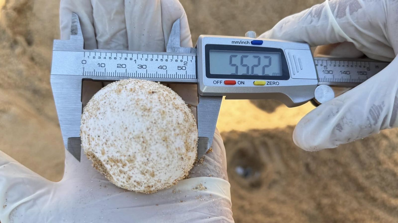 จากการตรวจสอบพบร่องรอยเต่าทะเลบริเวณชายหาด แต่มีสภาพเลือน ไม่สมบูรณ์ พื้นที่บริเวณหลุมมีร่องรอยการขุดหาไข่ เจ้าหน้าที่ตรวจวัดความกว้างรอยพายคู่หน้าได้ 165 ซม. ขนาดอกกว้าง 78 ซม. และทำการขุดหาไข่จนพบไข่เต่าที่ระดับความลึก 65 ซม. ตรวจวัดขนาดเส้นผ่าศูนย์กลางไข่ได้ 5.52 ซม. ซึ่งตำแหน่งวางไข่อยู่ในแนวน้ำทะเลท่วมถึง และมีต้นไม้อยู่ใกล้ๆ จะส่งผลต่อหลุมฟักไข่ ประกอบกับพื้นที่ดังกล่าวอยู่ห่างไกล รถยนต์เข้าไม่ถึง ซึ่งจะเป็นอุปสรรคต่อการเฝ้าระวังดูแลและการจัดเก็บข้อมูลด้านวิชาการ จึงประสานปรึกษากับนักวิชาการกลุ่มสัตว์ทะเลหายากใกล้สูญพันธ์ ศวอบ. และมีความเห็นร่วมกันให้ย้ายไข่เต่านำไปฟักและเฝ้าระวังดูแลบริเวณหาดคึกคัก อ.ตะกั่วป่า จ.พังงา ซึ่งเป็นพื้นที่ที่เต่ามะเฟืองเคยขึ้นมาวางไข่