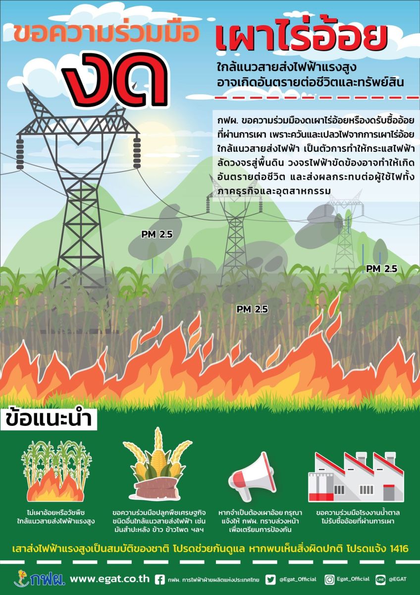 นายเสน่ห์ ตรีขันธ์ รองผู้ว่าการปฏิบัติการระบบส่ง การไฟฟ้าฝ่ายผลิตแห่งประเทศไทย (กฟผ.) เปิดเผยว่า ในช่วงฤดูกาลเก็บเกี่ยวผลผลิตทางการเกษตร เกษตรกรบางกลุ่มยังคงนิยมใช้วิธีเผาผลผลิตก่อนการเก็บเกี่ยว หรือหลังเก็บเกี่ยว เพื่อลดเวลาและต้นทุนด้านแรงงาน ซึ่งก่อเกิดปัญหามลพิษด้านอากาศ ทำให้เกิดฝุ่นละอองขนาดเล็ก หรือ PM 2.5 ที่ส่งผลกระทบต่อสุขภาพ ทำให้ทัศนวิสัยในการเดินทางและการคมนาคมไม่ชัดเจน กฟผ. จึงขอความร่วมมืองดการจุดไฟเผาไร่อ้อย วัชพืช และตอซังข้าว โดยเฉพาะในพื้นที่ใกล้แนวสายส่งไฟฟ้าแรงสูง เพื่อความปลอดภัยในชีวิตและทรัพย์สิน รวมถึงระบบไฟฟ้าของประเทศ เพราะควันและเขม่าจากการเผาอาจทำให้เกิดกระแสไฟฟ้าลัดวงจรสู่พื้นดิน เป็นอันตรายต่อเกษตรกรและประชาชนที่อยู่บริเวณดังกล่าว รวมทั้งอาจทำให้เกิดปัญหาไฟฟ้าตกหรือไฟฟ้าดับเป็นวงกว้างที่จะส่งผลกระทบต่อผู้ใช้ไฟฟ้าในภาพรวม และระบบเศรษฐกิจของประเทศ