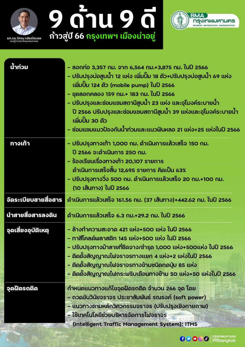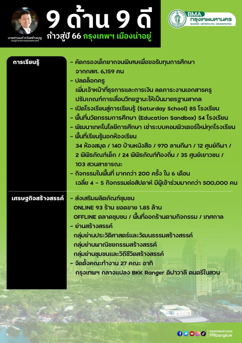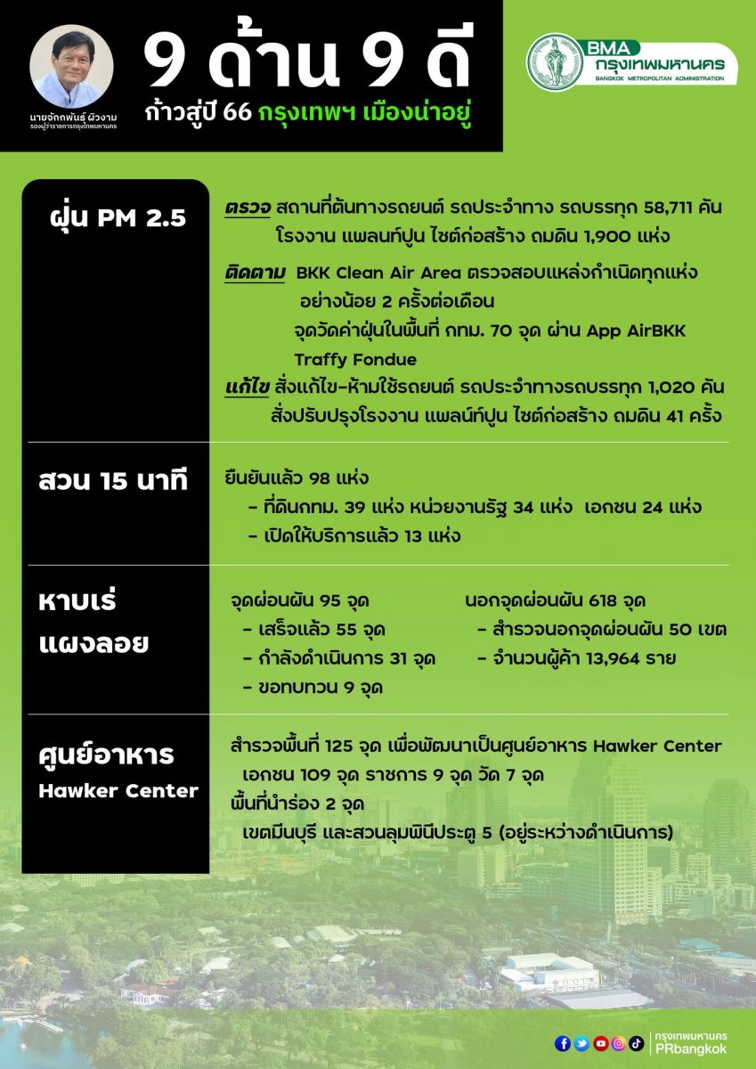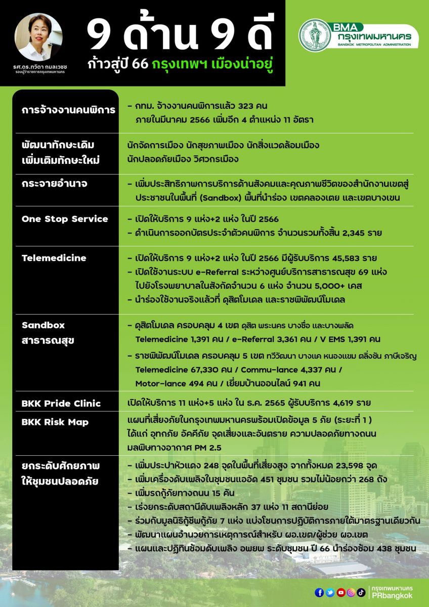สรุปประเด็นแถลงข่าว “9 ด้าน 9 ดี ก้าวสู่ปี 66 กรุงเทพฯ เมืองน่าอยู่” ทบทวนการทำงานที่ผ่านมา 6 เดือน 21 วัน ส่งของขวัญคนกรุงฯ พร้อมขอบคุณประชาชนและทุกภาคส่วน ที่ร่วมกันพัฒนาเมือง เพื่อให้กรุงเทพฯเป็นเมืองที่น่าอยู่สำหรับทุกคน