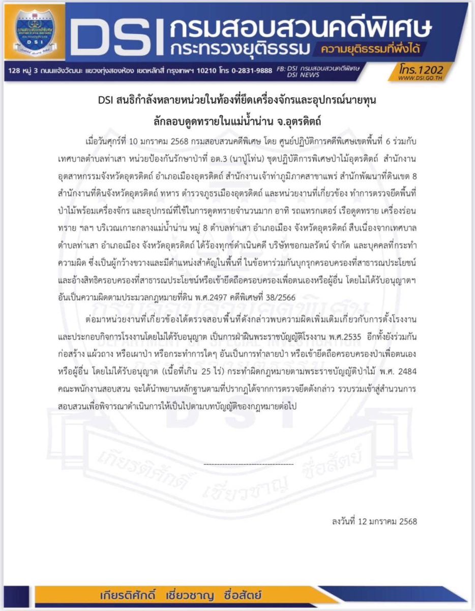 วันที่ 12 มกราคม 2568 กรมสอบสวนคดีพิเศษ โดย ศูนย์ปฏิบัติการคดีพิเศษเขตพื้นที่ 6 ร่วมกับเทศบาลตำบลท่าเสา หน่วยป้องกันรักษาป่าที่ อต.3 (นาปู่โท่น) ชุดปฏิบัติการพิเศษป่าไม้อุตรดิตถ์ สำนักงานอุตสาหกรรมจังหวัดอุตรดิตถ์ อำเภอเมืองอุตรดิตถ์ สำนักงานเจ้าท่าภูมิภาคสาขาแพร่ สำนักพัฒนาที่ดินเขต 8 สำนักงานที่ดินจังหวัดอุตรดิตถ์ ทหาร ตำรวจภูธรเมืองอุตรดิตถ์ และหน่วยงานที่เกี่ยวข้อง ทำการตรวจยึดพื้นที่ ป่าไม้พร้อมเครื่องจักร และอุปกรณ์ที่ใช้ในการดูดทรายจำนวนมาก อาทิ รถแทรกเตอร์ เรือดูดทราย เครื่องร่อนทราย ฯลฯ บริเวณเกาะกลางแม่น้ำน่าน หมู่ 8 ตำบลท่าเสา อำเภอเมือง จังหวัดอุตรดิตถ์