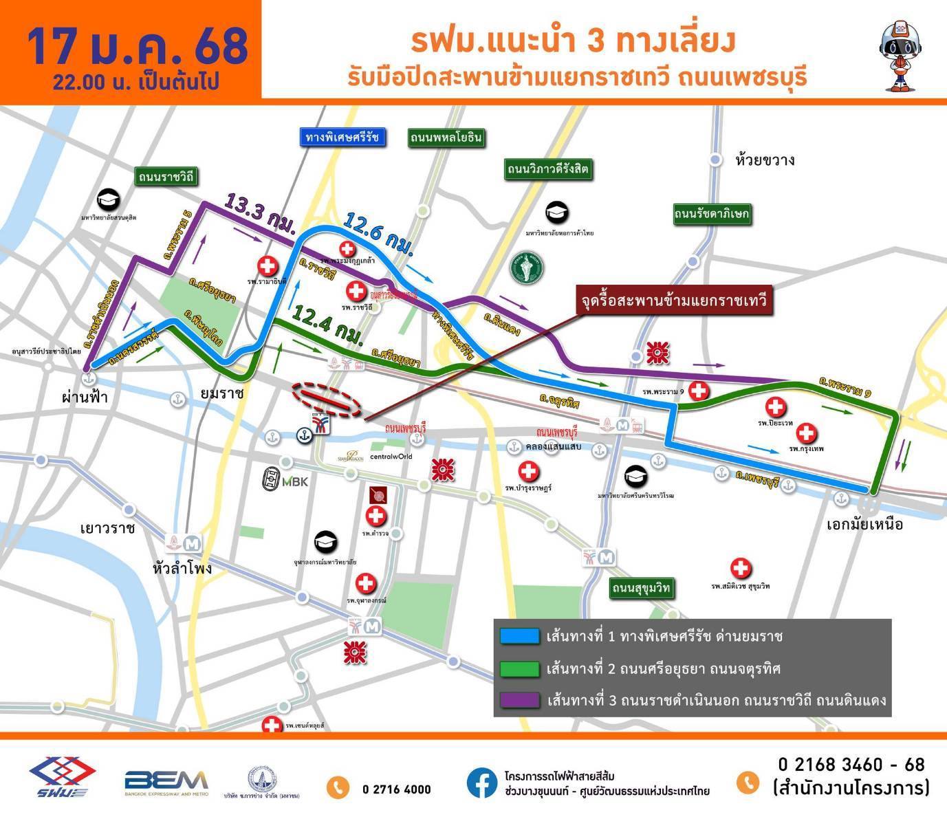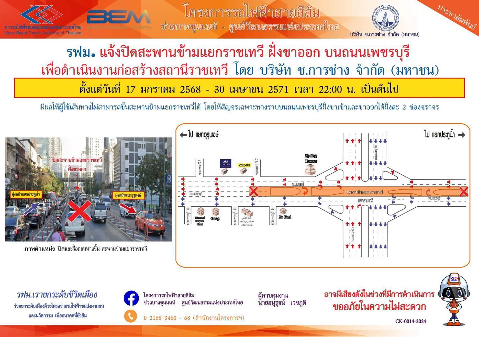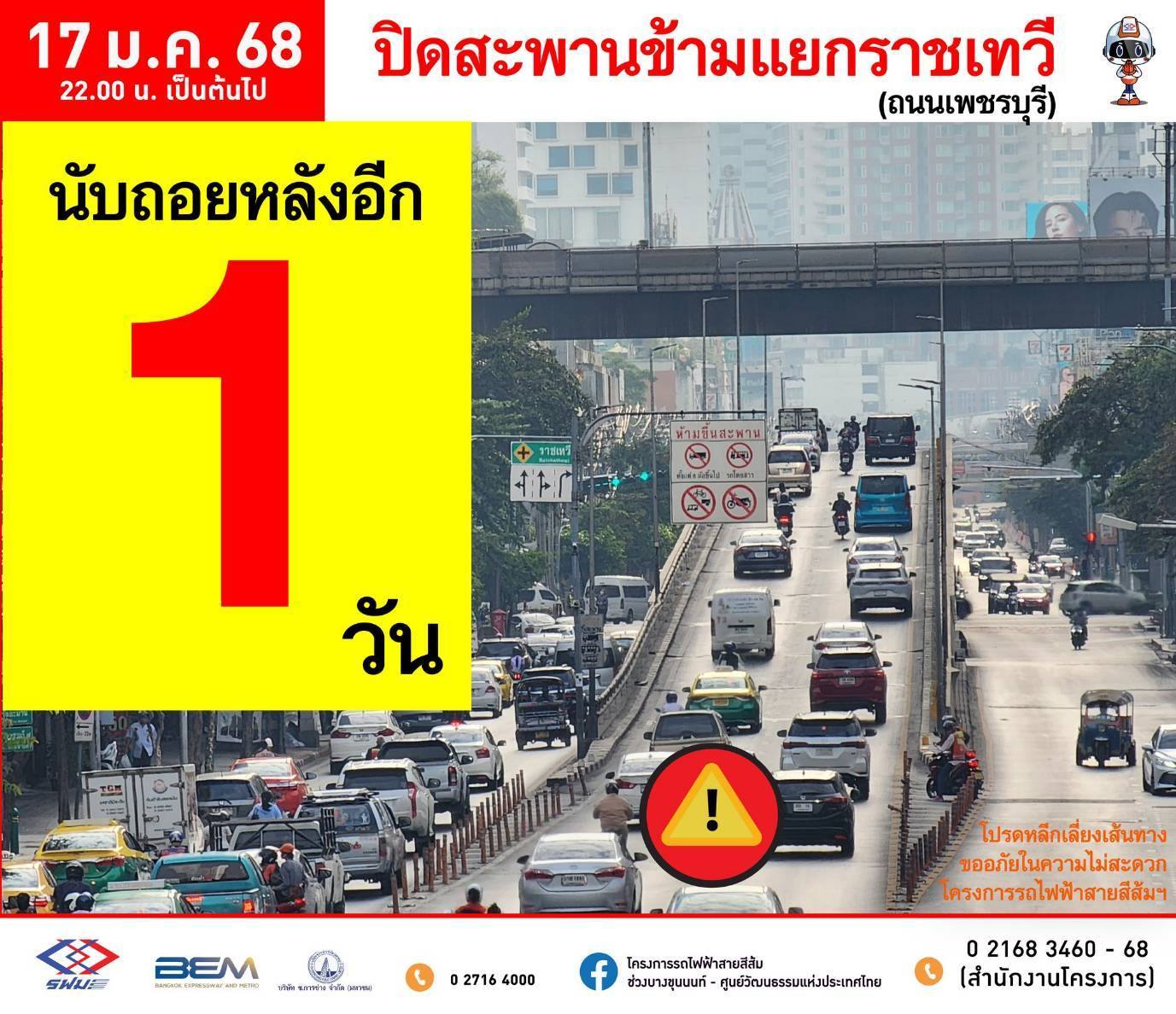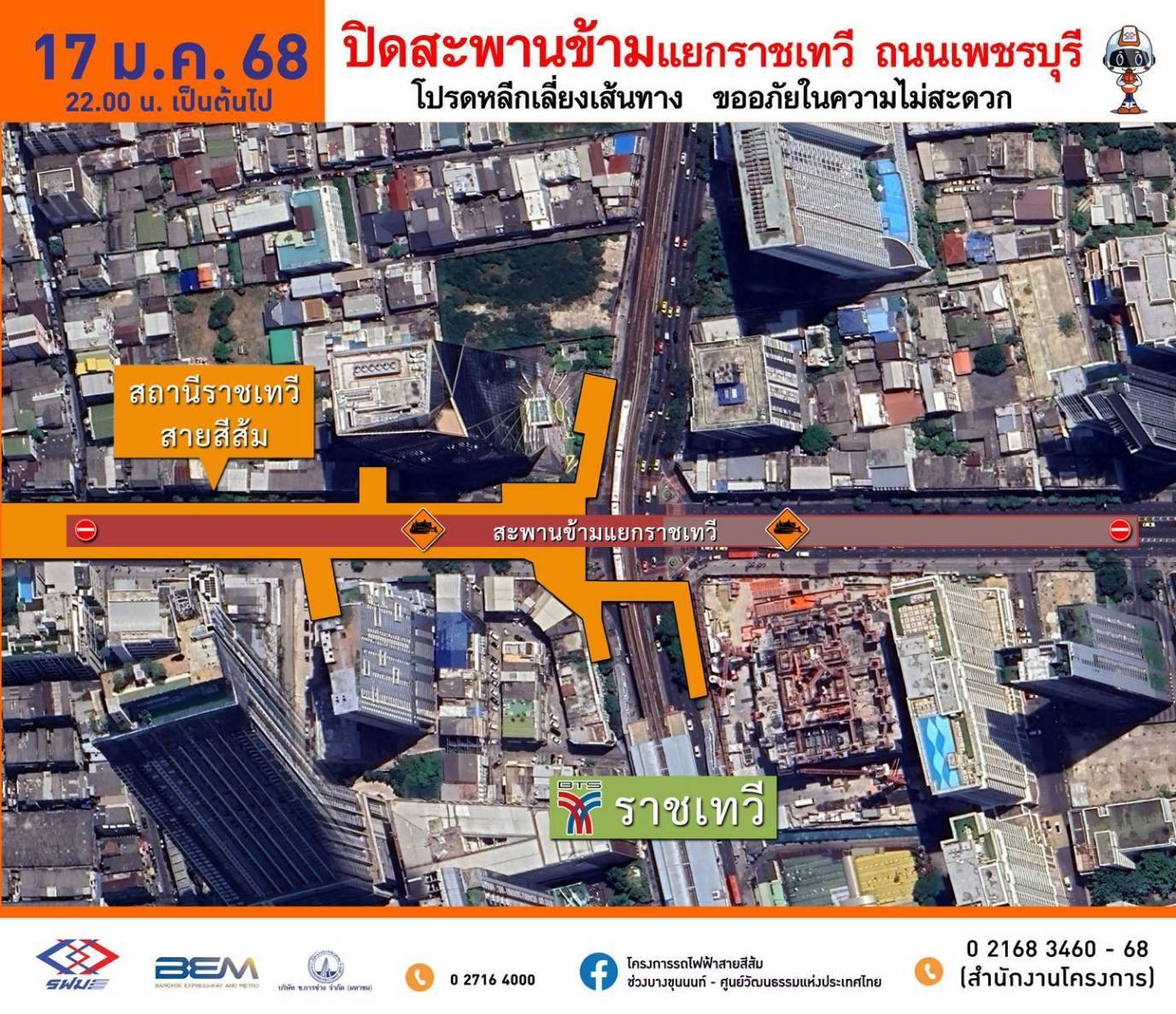 อีก 1 วัน! ปิดสะพานข้ามแยกราชเทวี เพื่อดำเนินการก่อสร้างโครงการรถไฟฟ้าสายสีส้มช่วงบางขุนนนท์ - ศูนย์วัฒนธรรมแห่งประเทศไทย