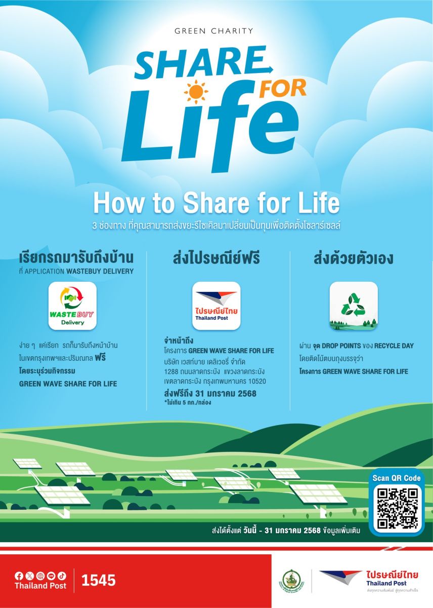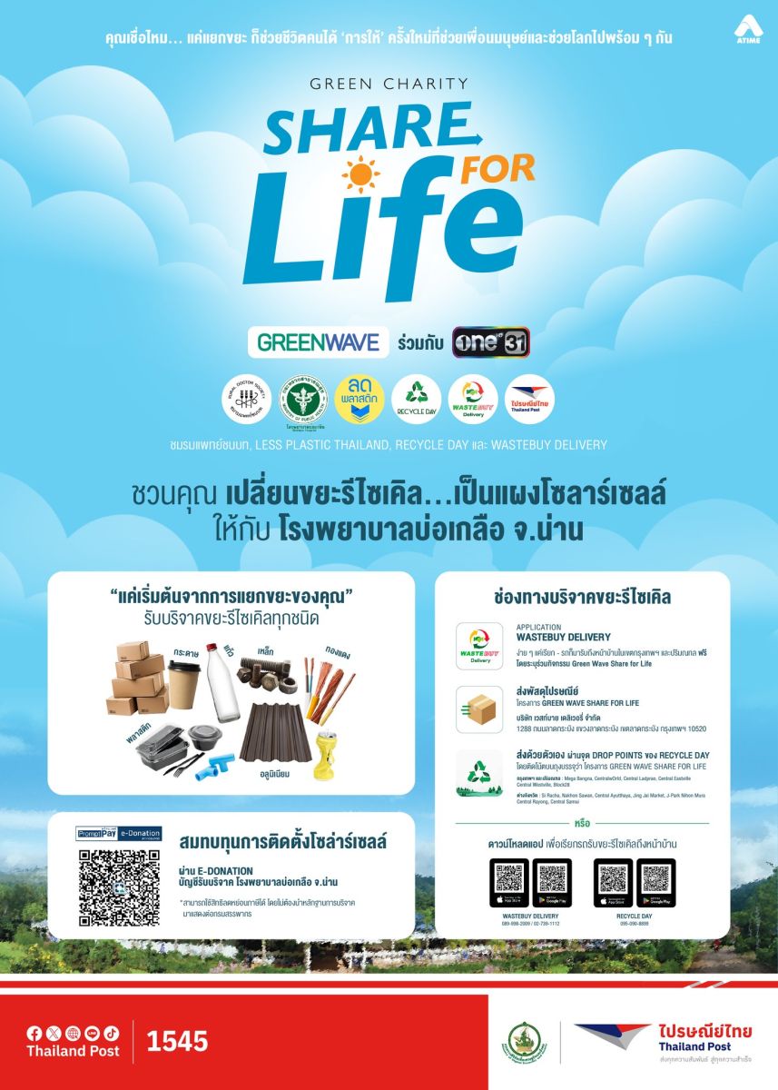 กรุงเทพฯ 16 มกราคม 2568 – บริษัท ไปรษณีย์ไทย จำกัด ร่วมกับ คลื่นกรีนเวฟ พร้อมพันธมิตร ได้แก่ กระทรวงสาธารณสุข ชมรมแพทย์ชนบท Less Plastic Thailand , Recycle Day และ Wastebuy Delivery เปิดรับขยะประเภทกระดาษ แก้ว เหล็ก อลูมิเนียม ทองแดง ทองเหลือง และพลาสติก เข้าสู่กระบวนการรีไซเคิล ในโครงการ Green Charity Share for life เพื่อเปลี่ยนกลุ่มขยะดังกล่าวเป็นทุนในการติดตั้งแผงโซลาร์เซลล์ให้กับโรงพยาบาลบ่อเกลือ จ.น่าน โดยบรรจุใส่กล่องพัสดุที่มีน้ำหนักไม่เกิน 5 กิโลกรัม จ่าหน้ากล่องถึง โครงการ Green Wave Share for life ส่งได้ ณ ไปรษณีย์ทั่วประเทศโดยไม่มีค่าใช้จ่าย