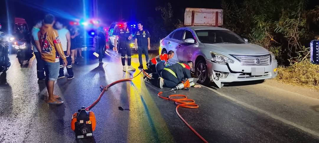 รถจักรยานยนต์ล้มคว่ำ รถเก๋งขับตามหลังชนและทับซ้ำ มีผู้เสียชีวิตอยู่ใต้ท้องรถ กลางถนนหมายเลข 304 จ.ปราจีนบุรี