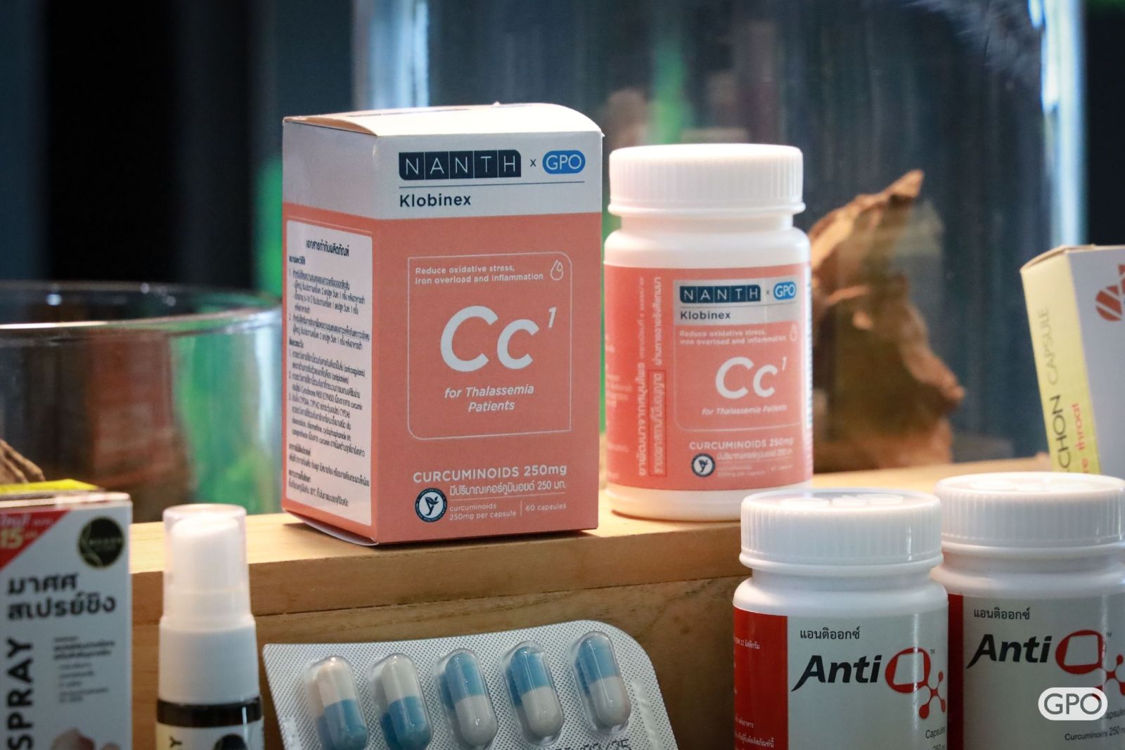 อภ. ได้เตรียมออกผลิตภัณฑ์ใหม่ ภายใต้ชื่อ นันท์ จีพีโอ - โกลบิเน็กซ์ ซึ่งเป็นผลิตภัณฑ์ที่ผลิตจากสารสกัดขมิ้นชัน โดยใน 1 แคปซูล ประกอบไปด้วย สารสกัดขมิ้นชันเทียบเท่าสารเคอร์คูมินอยด์ 250 มิลลิกรัม มีสรรพคุณลดความรุนแรงของภาวะเครียดออกซิเดชัน และใช้เสริมการรักษาเพื่อลดความรุนแรงของภาวะเหล็กเกินและภาวะอักเสบ ในผู้ป่วยโรคเบต้าธาลัสซีเมีย ซึ่งขณะนี้ได้ผ่านการขึ้นทะเบียนจากสำนักงานคณะกรรมการอาหารและยาเรียบร้อยแล้ว ทั้งนี้ผลิตภัณฑ์ดังกล่าว จะใช้วัตถุดิบขมิ้นชันที่ปลูกในพื้นที่จังหวัดน่าน โดยทางสถาบัน เค อะโกร-อินโนเวท ภายใต้มูลนิธิกสิกรไทย จะช่วยส่งเสริมและสนับสนุนให้ชุมชนในจังหวัดน่าน ปลูกพืชยา เพื่อใช้ในการผลิตผลิตภัณฑ์ต่อไป คาดว่าจะสามารถออกสู่ตลาดได้ในเร็วๆนี้