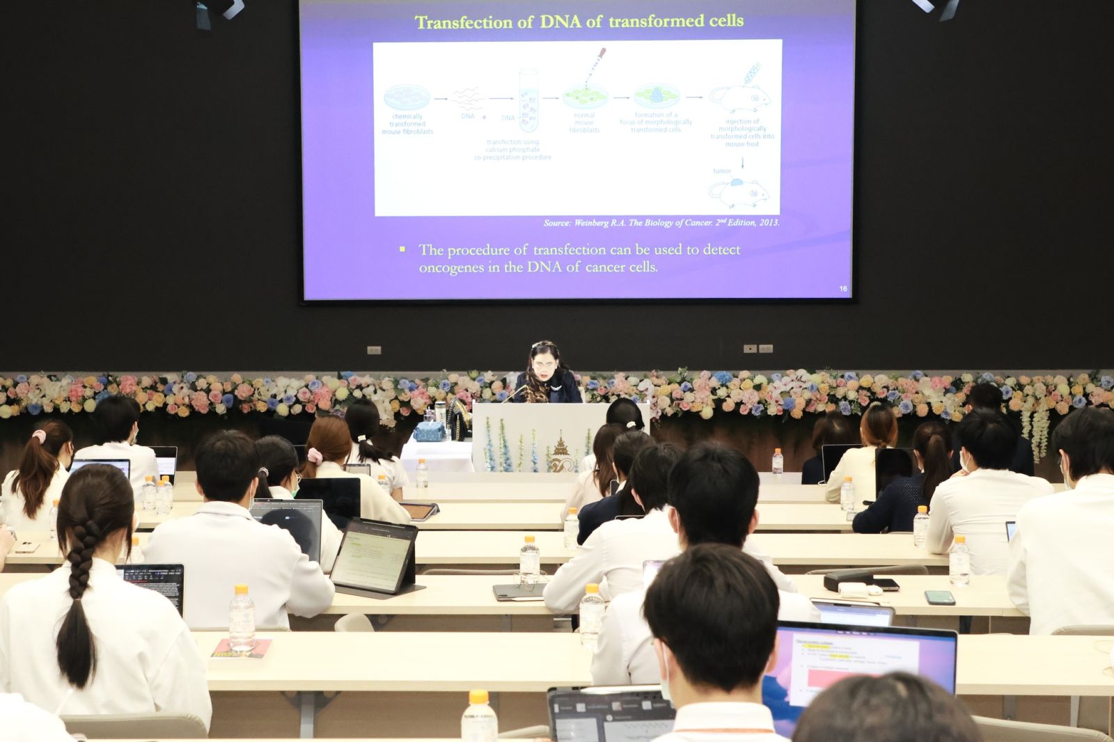 วันอังคารที่ ๑๔ มกราคม ๒๕๖๘ เวลา ๑๒.๑๕ น. ศาสตราจารย์ ดร. สมเด็จพระเจ้าน้องนางเธอ เจ้าฟ้าจุฬาภรณวลัยลักษณ์ อัครราชกุมารี กรมพระศรีสวางควัฒน วรขัตติยราชนารี เสด็จไปยังคณะแพทยศาสตร์ศรีสวางควัฒน ราชวิทยาลัยจุฬาภรณ์ เขตหลักสี่ กรุงเทพมหานคร ทรงบรรยายพิเศษ เรื่อง กลไกการเกิดโรคมะเร็ง (Oncogenesis) เป็นวันที่สอง พระราชทาน แก่คณาจารย์ นักวิชาการ และนักศึกษาหลักสูตรแพทยศาสตรบัณฑิต ชั้นปีที่ ๓ ของคณะแพทยศาสตร์ศรีสวางควัฒน รวม ๖๔ คน หัวข้อการบรรยายพิเศษในวันนี้ เรื่อง อองโคยีน (Oncogene) หรือ ยีนมะเร็งและการควบคุมการเจริญเติบโตของเซลล์ ยีนยับยั้งการเกิดมะเร็ง (Tumor Suppressor Genes) และการควบคุมวัฏจักรของเซลล์ โรคมะเร็งเกิดขึ้นจากการกลายพันธุ์ของเซลล์ที่แบ่งตัวและเจริญเติบโตอย่างรวดเร็วจนไม่สามารถควบคุมได้ และเกิดได้จากไวรัสที่เข้าแทรกแซงเข้าไปในเซลล์และเข้าควบคุมการทำงานของยีนในเซลล์ที่ปกติ ซึ่งจากการศึกษาวิจัยในระดับโมเลกุลพบว่าการกลายพันธุ์ของยีน การแทรกแซงของยีน หรือการแลกเปลี่ยนชิ้นส่วนของโครโมโซมสามารถเพิ่มการแสดงออกของยีนมะเร็ง ในสภาวะปกติเซลล์จะถูกควบคุมให้มีการเจริญเติบโตในอัตราที่เหมาะสม แต่เมื่อมีการแสดงออกของยีนมะเร็งที่สูงกว่าปกติ เซลล์จะถูกกระตุ้นให้มีการแบ่งตัวเร็วขึ้นและต่อต้านกระบวนการตายของเซลล์ นอกจากยีนมะเร็งแล้วยังมียีนยับยั้งการเกิดมะเร็งหลายชนิดที่ทำหน้าที่ยับยั้งการเจริญเติบโตของมะเร็งแตกต่างกัน ยกตัวอย่างเช่น ยีน p53 ที่สร้างโปรตีนจำเพาะซึ่งทำหน้าที่ตรวจจับความผิดปกติทางพันธุกรรม จากการศึกษาในผู้ป่วยพบว่าการกลายพันธุ์ของยีน p53 มีความสัมพันธ์กับการเกิดโรคมะเร็งหลอดอาหารและมะเร็งลำไส้ นอกจากนี้ การกลายพันธุ์ของยีนที่ทำหน้าที่ควบคุมวัฏจักรของเซลล์อาจก่อให้เกิดมะเร็งขึ้นผ่านกระบวนการต่อต้านการทำลายตัวเองแบบอัตโนมัติ ซึ่งการกลายพันธุ์นี้อาจเกิดจากกรรมพันธุ์หรือถูกกระตุ้นจากปัจจัยภายนอก