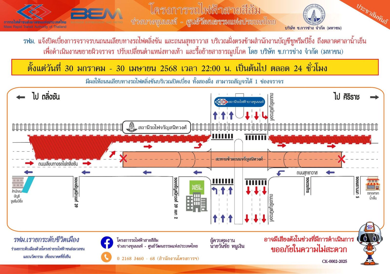 รฟม. แจ้งปิดเบี่ยงจราจรบนถนนเลียบทางรถไฟตลิ่งชัน และถนนสุทธาวาสบริเวณฝั่งตรงข้ามสำนักงานบัญชีซูพรีมบีอิ้ง ถึงตลาดศาลาน้ำเย็นเพื่อดำเนินงานขยายผิวจราจร ปรับเปลี่ยนตำแหน่งทางเท้า และรื้อย้ายสาธารณูปโภค โครงการรถไฟฟ้าสายสีส้ม ช่วงบางขุนนนท์ - ศูนย์วัฒนธรรมแห่งประเทศไทย ตั้งแต่วันที่ 30 มกราคม – 30 เมษายน 2568 เวลา 22.00 น. เป็นต้นไป ตลอด 24 ชั่วโมง