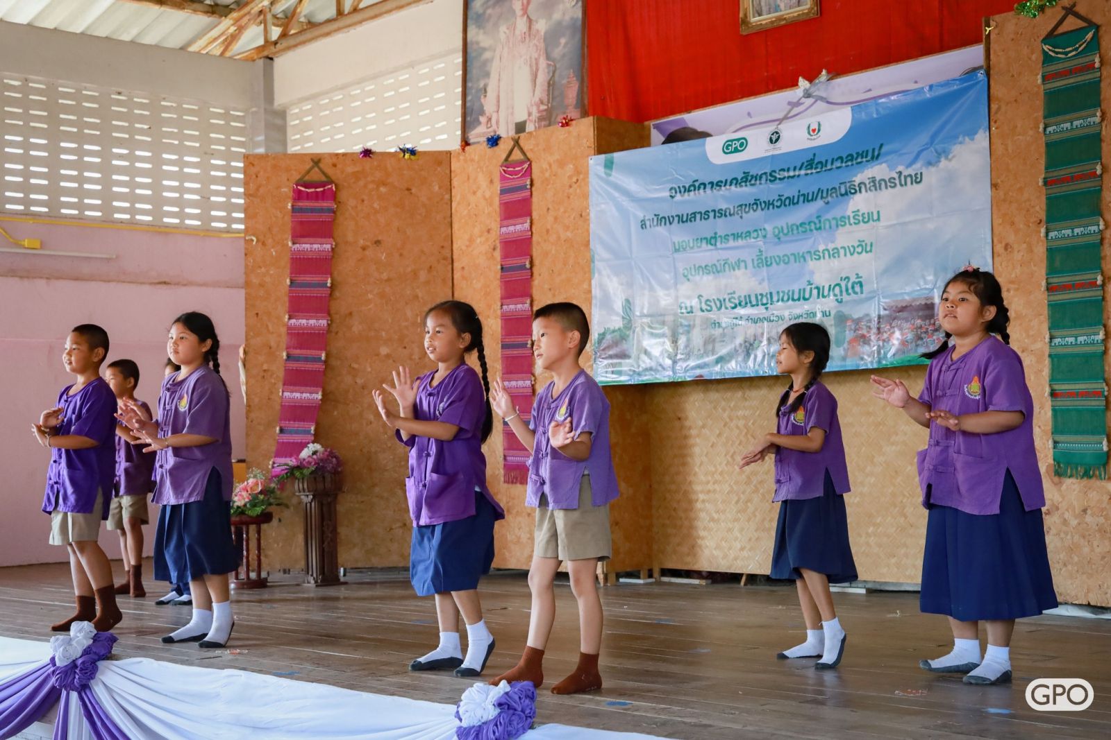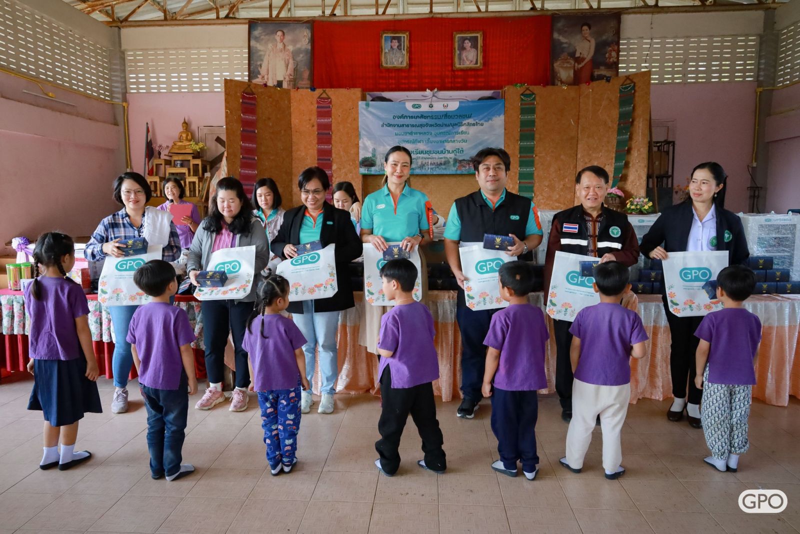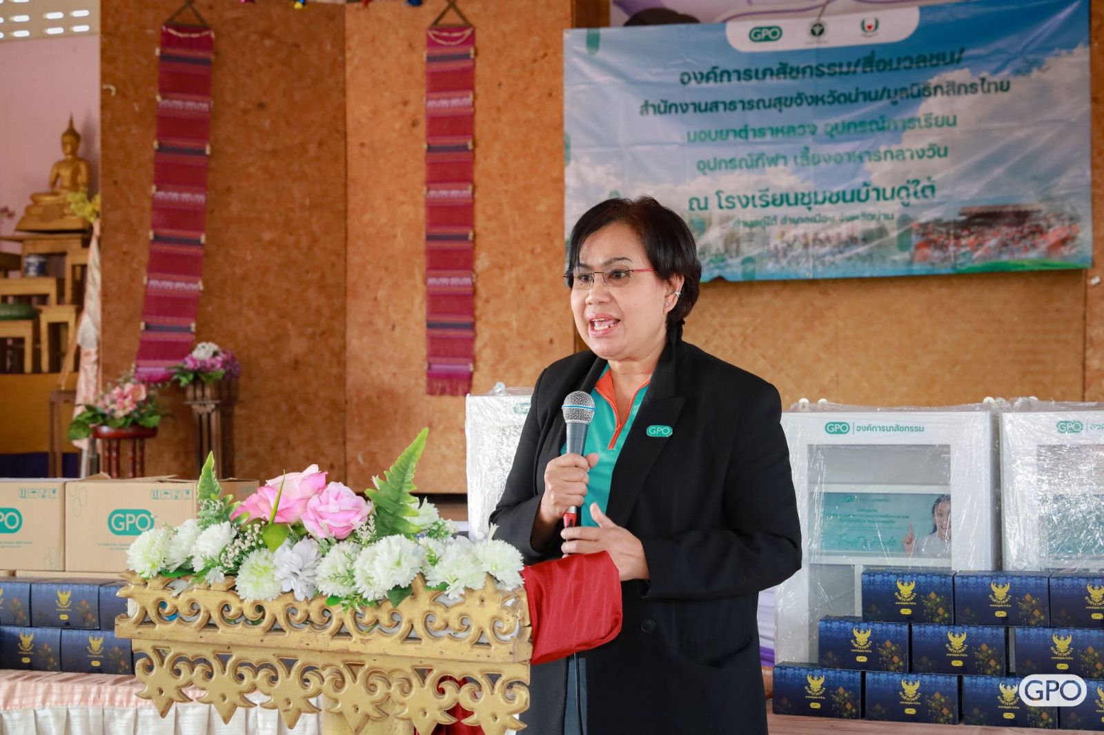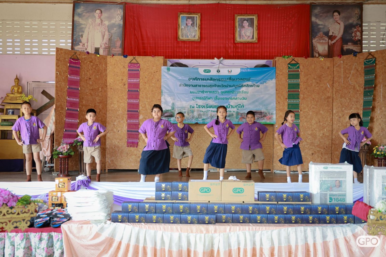 องค์การเภสัชกรรม ร่วมกับสื่อมวลชน และภาคีเครือข่าย ลงพื้นที่มอบยาตำราหลวง ตู้ยาพร้อมยา อุปกรณ์ การเรียน อุปกรณ์กีฬา และเลี้ยงอาหารกลางวัน นักเรียนโรงเรียนชุมชนบ้านดู่ใต้ จังหวัดน่าน