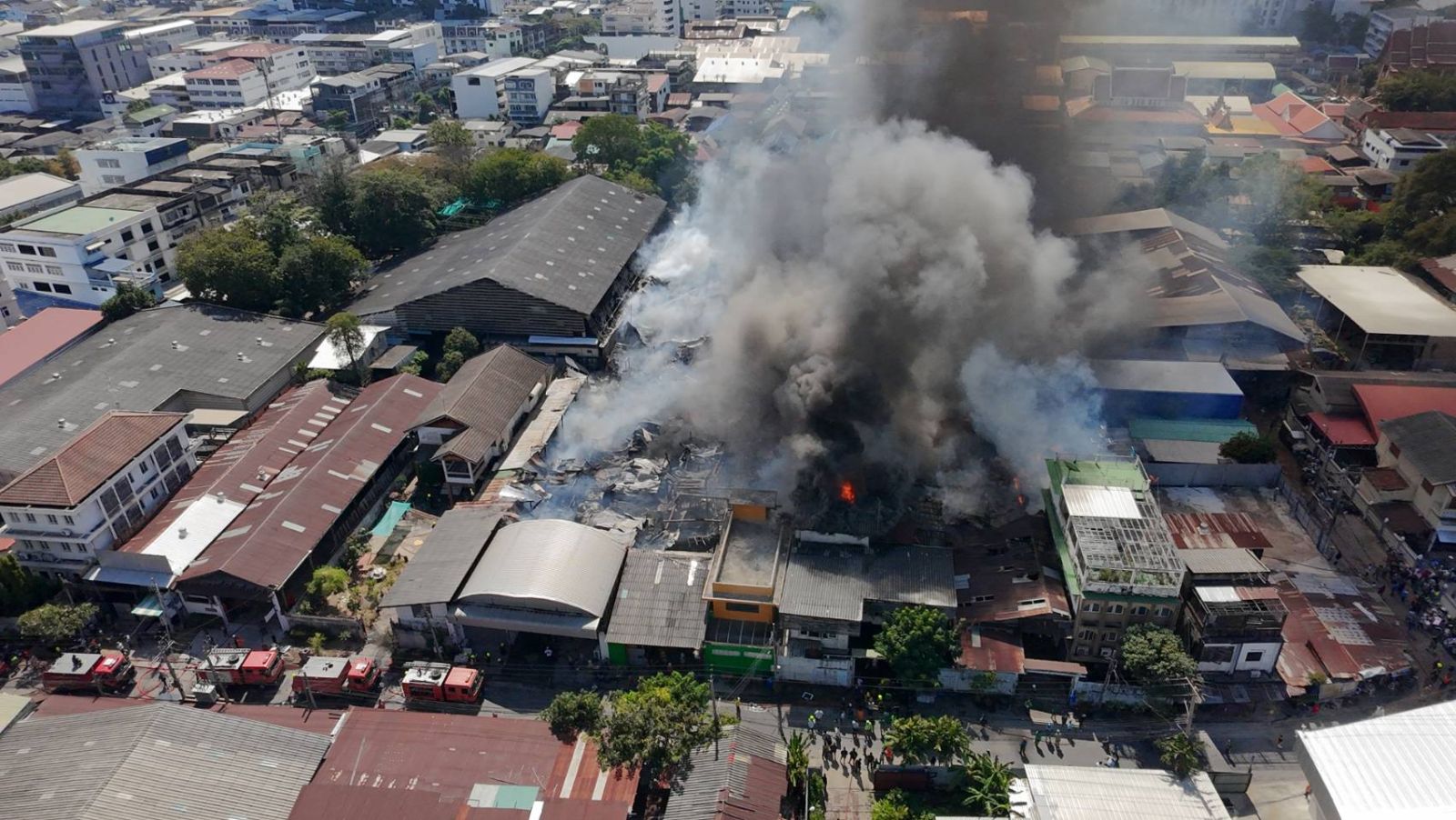เวลา 10.53 น. แสงเพลิงยังคงลุกไหม้ภายในโรงไม้ ไม่มีทีท่าลุกลามอาคารข้างเคียง เจ้าหน้าที่อยู่ระหว่างวางหัวฉีดล้อมเพลิง
