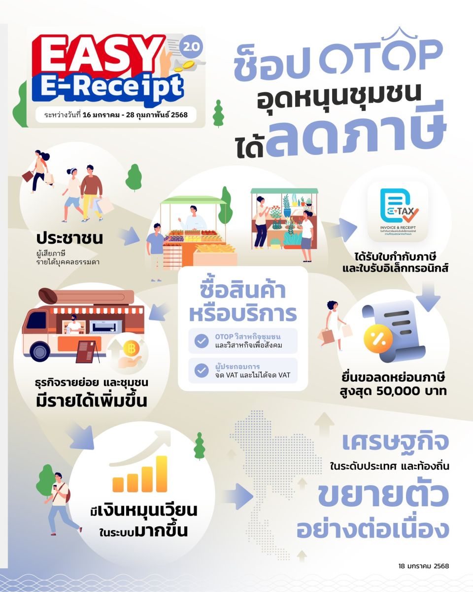 รัฐบาลพร้อมสานต่อ ‘Easy E-Receipt’ นโยบายดีๆ ที่นอกจากจะลดภาษีให้พี่น้องประชาชน ยังเป็นการกระจายรายได้ให้กับพ่อค้าแม่ค้ารายย่อย กลุ่มสินค้า OTOP และกลุ่มวิสาหกิจอีกด้วยค่ะ ทั้งหมดนี้เพื่อสร้างแรงกระตุ้นให้เศรษฐกิจไทยทั้งในระดับประเทศและระดับท้องถิ่น ขยายตัวอย่างต่อเนื่องตลอดปี 2568 เป็นการสร้างศักยภาพทางเศรษฐกิจจากฐานรากสู่ภาพใหญ่