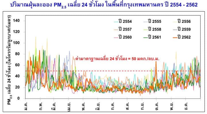 ขณะที่ นพ.มนูญ ลีเชวงวงศ์ แพทย์เชี่ยวชาญด้านโรคระบบการหายใจและผู้ป่วยหนัก ให้ความเห็นเกี่ยวกับสถานการณ์ฝุ่น PM2.5 โดยระบุว่า ฝุ่น PM2.5 ในพื้นที่กรุงเทพมหานคร มีมานานแล้ว ย้อนหลังไป พ.ศ.2554 ตั้งแต่เริ่มมีการวัดค่าฝุ่น PM2.5 จะเห็นค่าฝุ่น PM2.5 อยู่ต่ำกว่าค่ามาตรฐานเดือนเมษายนถึงพฤศจิกายน และสูงกว่าค่ามาตรฐานเดือนธันวาคมถึงมีนาคมทุกปี พร้อมได้นำกราฟมาแสดงให้เห็นค่าฝุ่น PM2.5 แต่ละปี ที่ไม่ได้แย่ลง