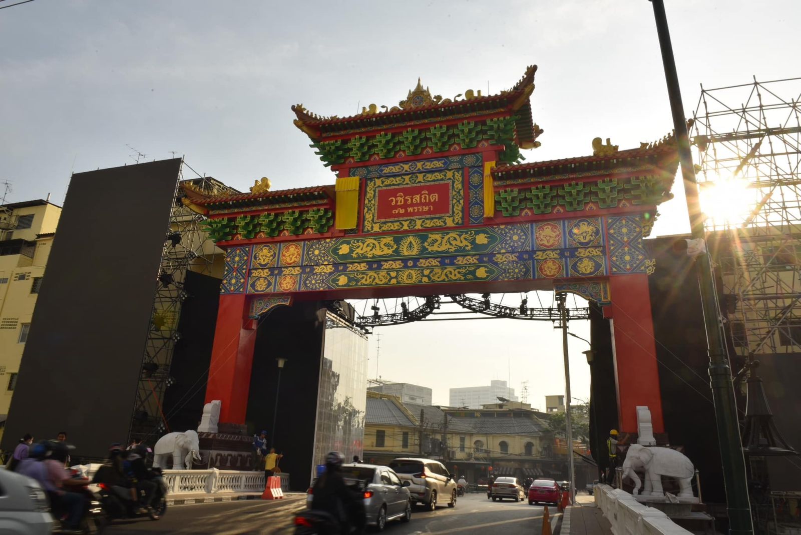 สำหรับพิธีเปิดซุ้มประตูเฉลิมพระเกียรติ 72 พรรษา ได้รับพระมหากรุณาธิคุณจาก พระบาทสมเด็จพระเจ้าอยู่หัว และสมเด็จพระนางเจ้าฯ พระบรมราชินี ทรงพระกรุณาโปรดเกล้าฯ เสด็จพระราชดำเนินไปทรงเป็นประธานเปิดซุ้มประตู “วชิรสถิต 72 พรรษา” บริเวณสะพานดำรงสถิต และซุ้มประตู “วชิรธำรง 72 พรรษา” บริเวณห้าแยกหมอมี จึงขอเชิญชวนชาวไทยและชาวไทยเชื้อสายจีน ร่วมเฝ้าทูลละอองธุลีพระบาทรับเสด็จฯ ในวันเสาร์ที่ 25 ม.ค. 68 เวลา 17.00 น. ณ ถนนเจริญกรุง เขตสัมพันธวงศ์