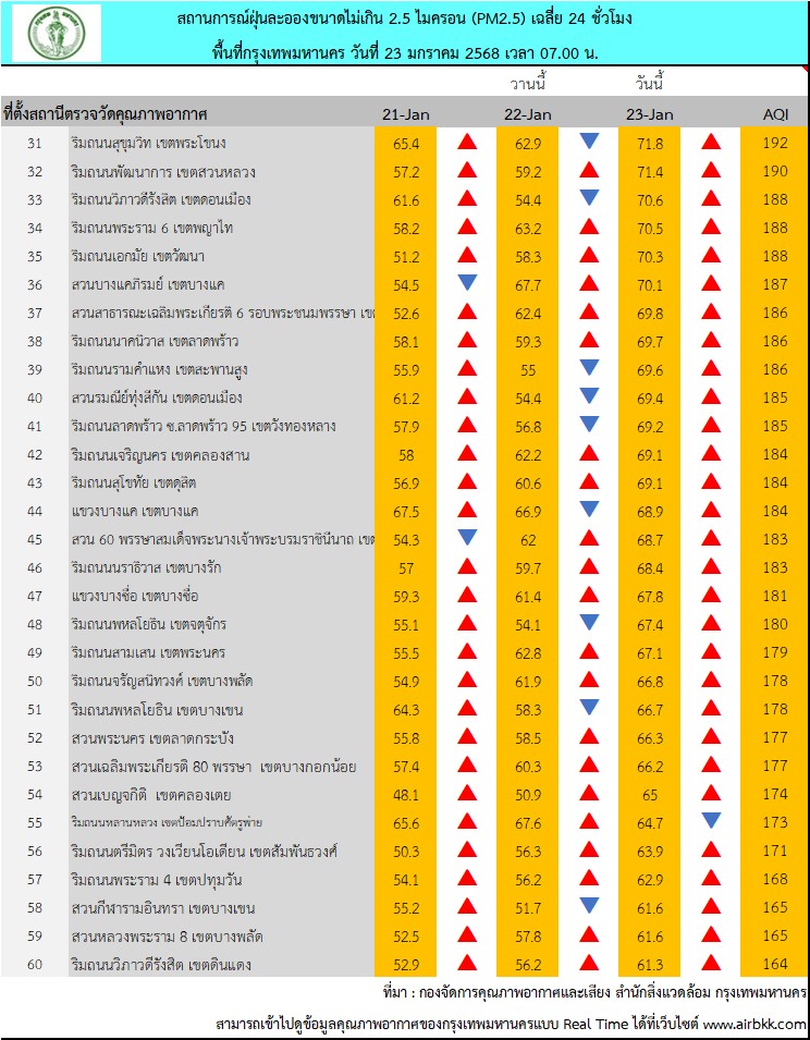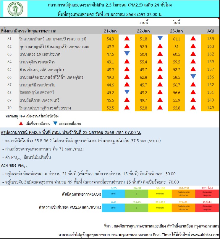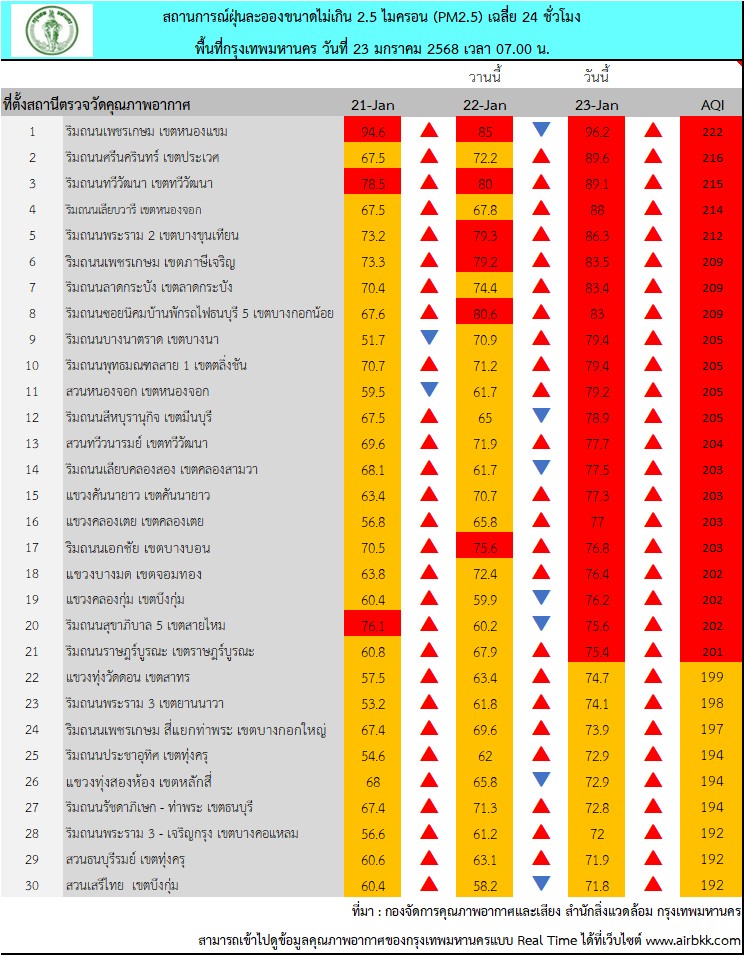 ศูนย์ข้อมูลคุณภาพอากาศกรุงเทพมหานครขอรายงานสถานการณ์ฝุ่นละออง PM 2.5 ของสถานีตรวจวัดคุณภาพอากาศของกรุงเทพมหานคร ประจำวันพฤหัสบดีที่ 23 มกราคม พ.ศ. 2568 เวลา 07.00 น. ค่าเฉลี่ย 24 ชั่วโมง ของฝุ่นละอองขนาดไม่เกิน 2.5 ไมครอน (PM2.5) ตรวจวัดได้ 55.8-96.2 ไมโครกรัม/ลูกบาศก์เมตร (มคก./ลบ.ม.) พบว่าเกินมาตรฐานอยู่ในระดับสีแดง มีผลกระทบต่อสุขภาพ (มาตรฐาน 75.1 มคก./ลบ.ม.ขึ้นไป ) จำนวน 21 พื้นที่ คือ